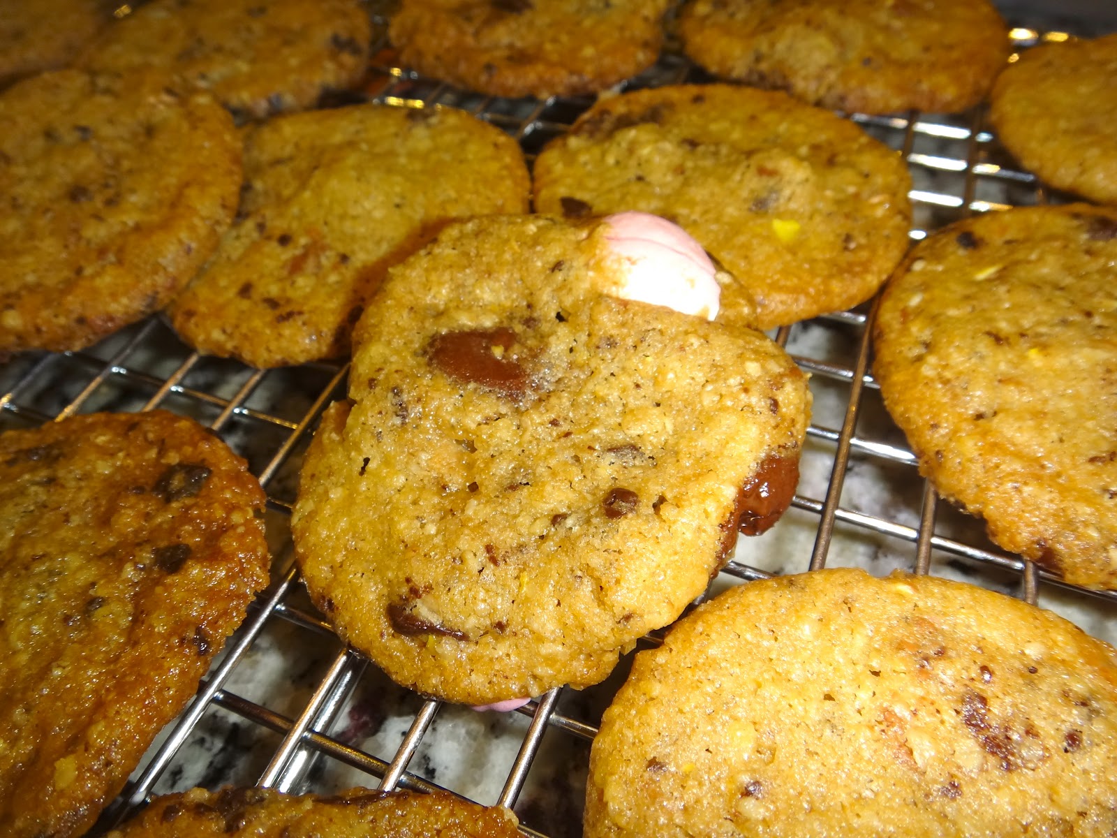 Y las chispas. Además de chispas de chocolate semi amargo, me gusta picar chocolates que tenga en la despensa, está vez fueron huevitos Cadbury de Pascua. Una parte picada finamente. (En el horno eso se derrite en la masa.. yum.
