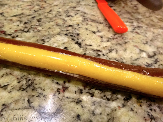 - Haz “tripas” con cada masa y acomoda alternando sobre plástico autoadherente para hacer un cilindro.