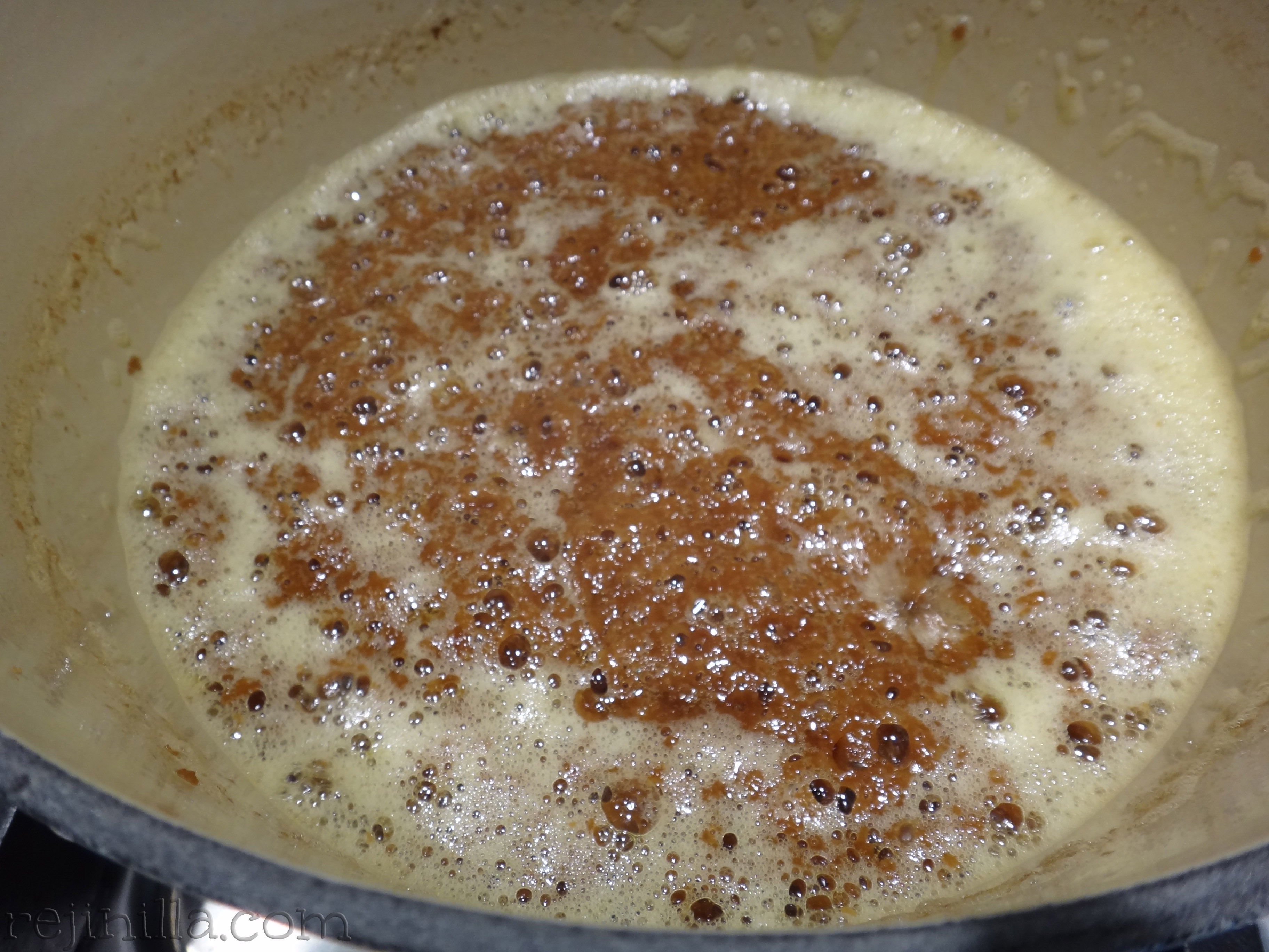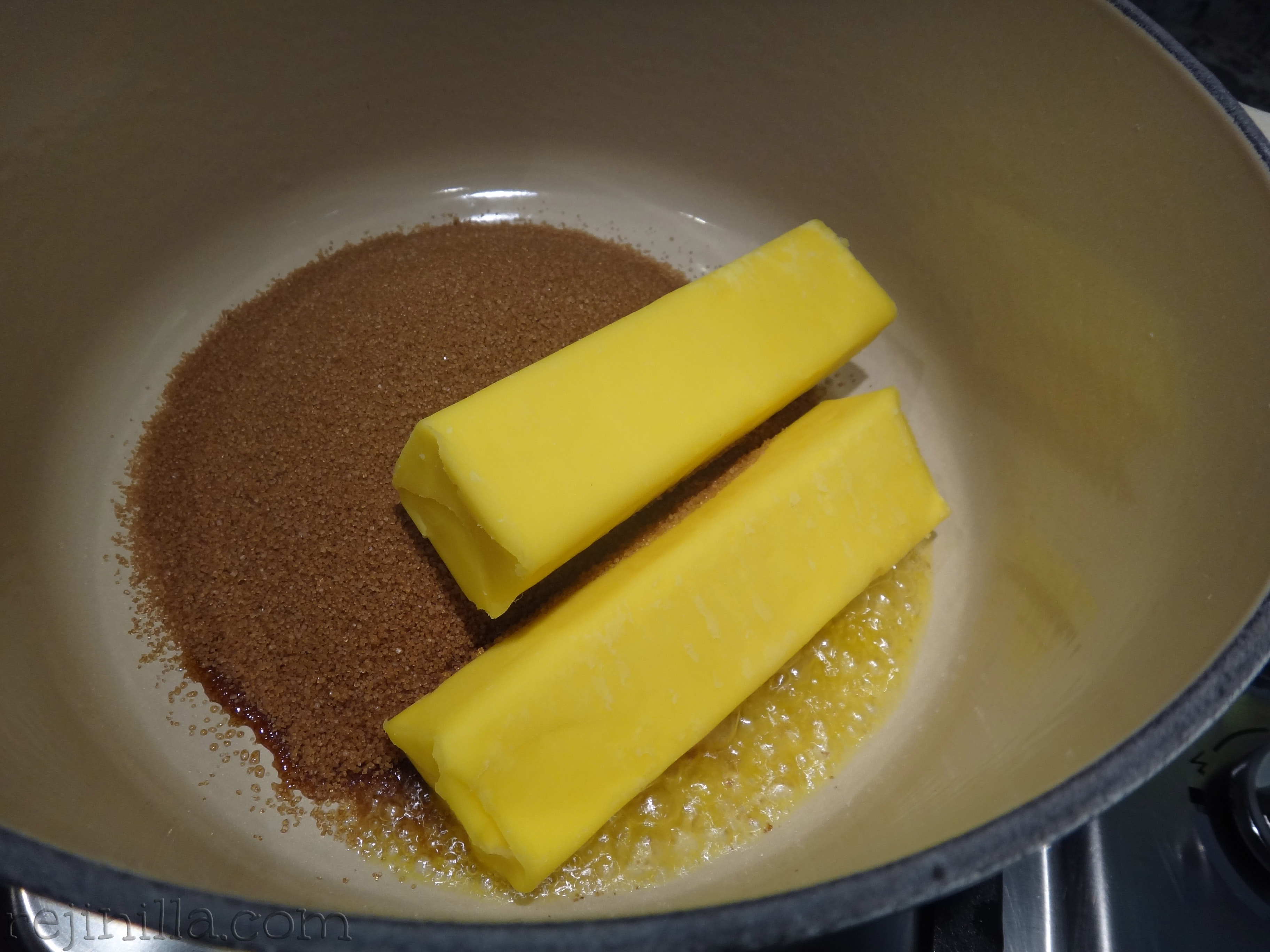 No es de dieta. Derrite mantequilla y azúcar hasta que la mezcla burbujee. Revuelve continuamente, por 10 minutos más.