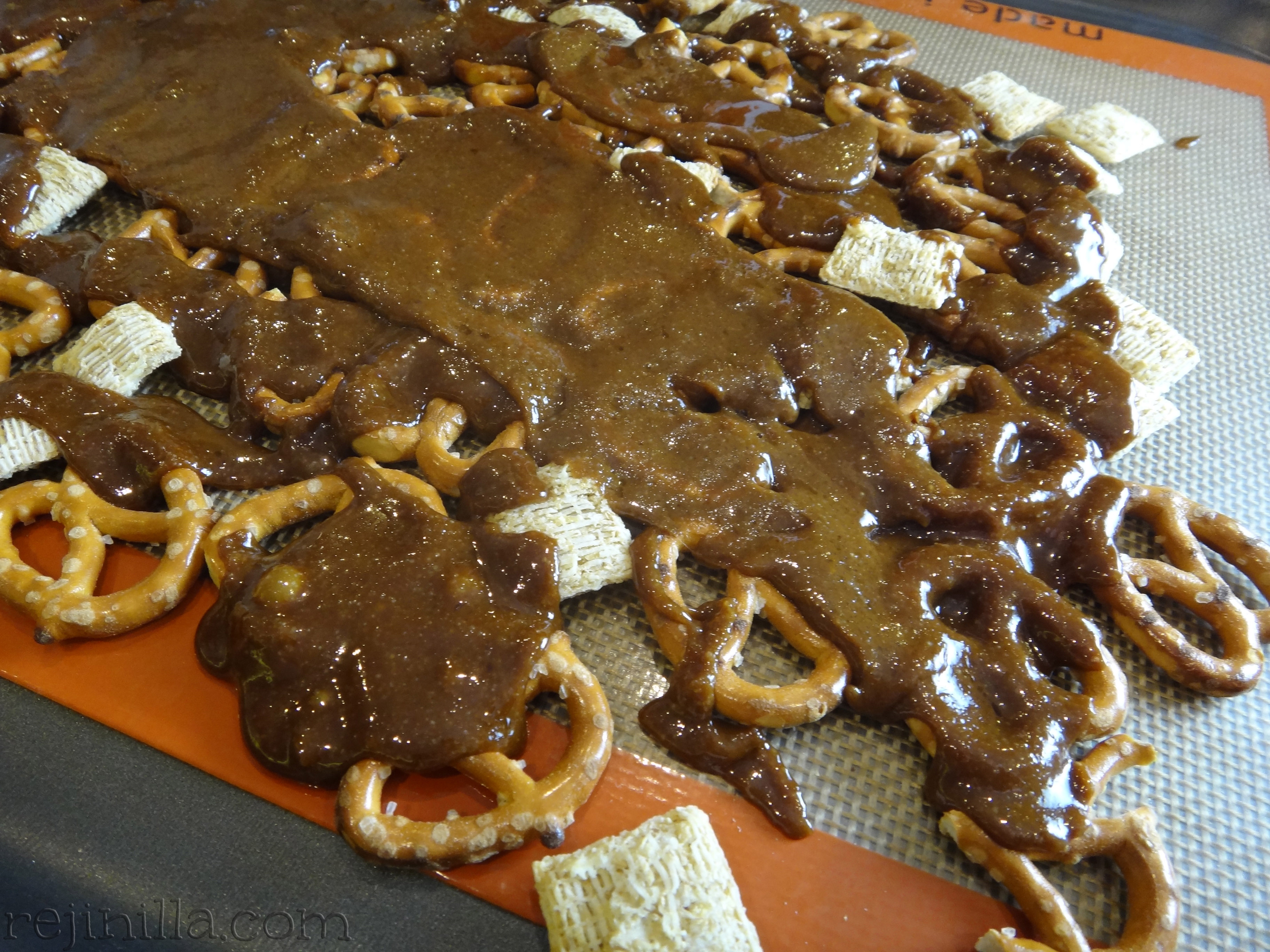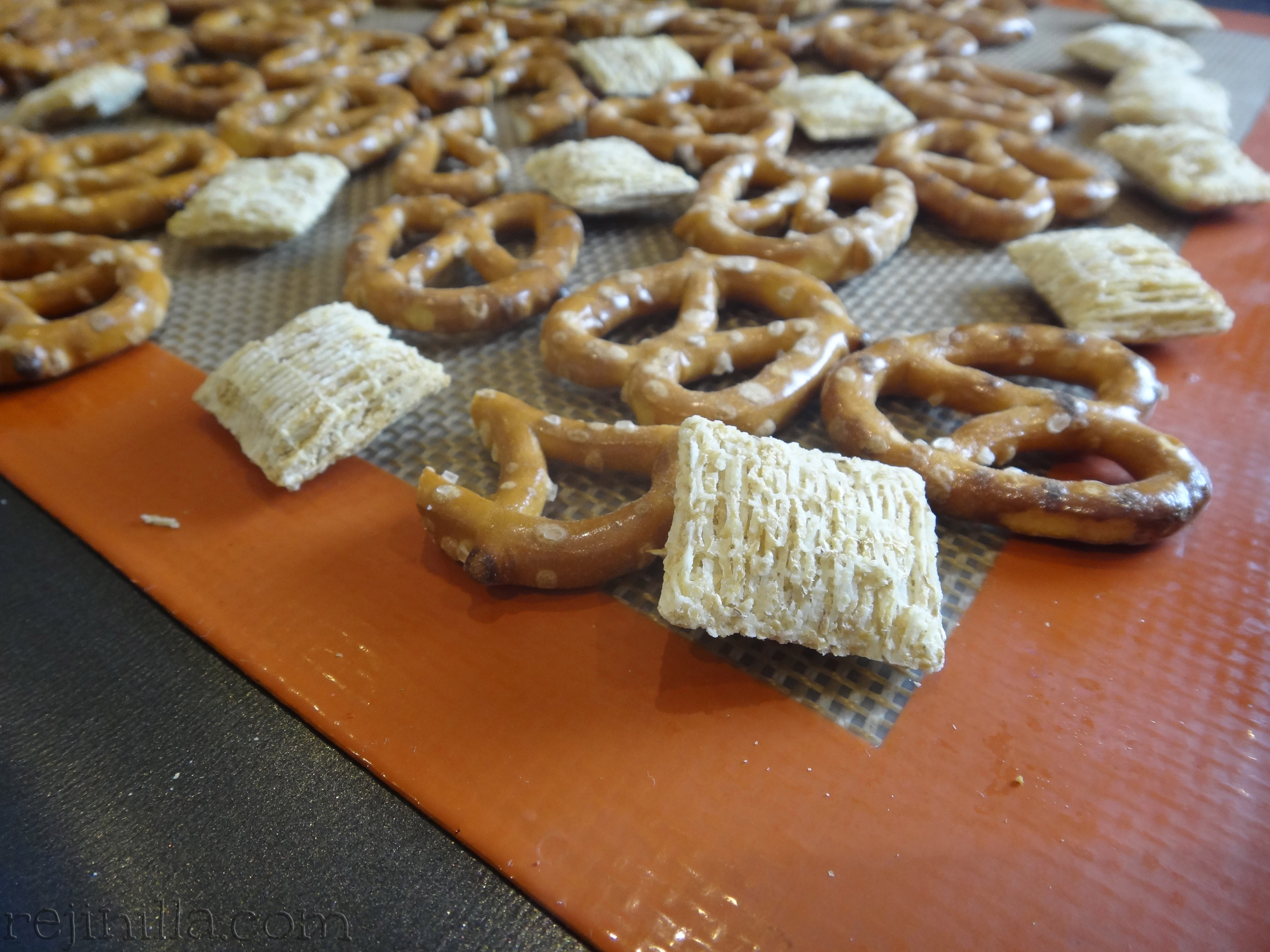 Mientras tanto, acomoda en una charola los pretzels, y porqué no, un poco de cereal. También pueden ser galletas saladas, como la vez que hice toffee de goldfish.