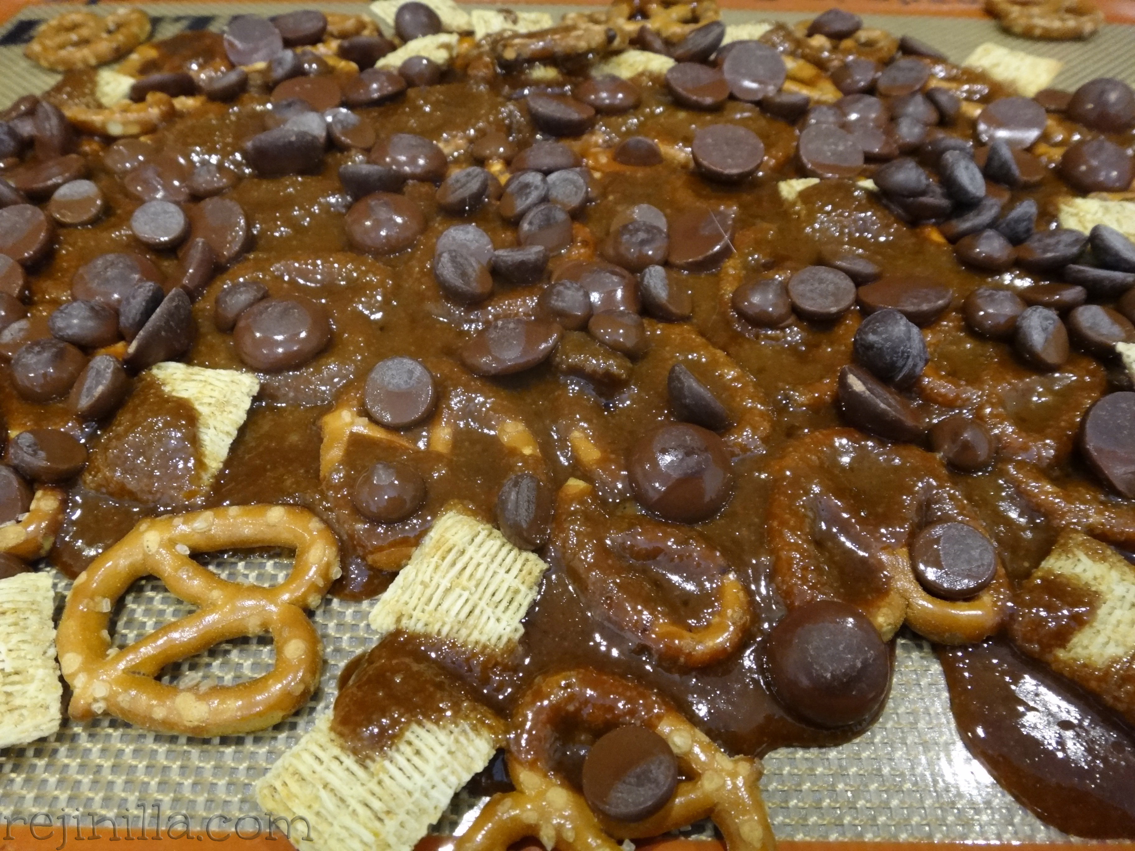 Vacía el caramelo burbujeante sobre los pretzels y mete al horno por unos 15 minutos más.