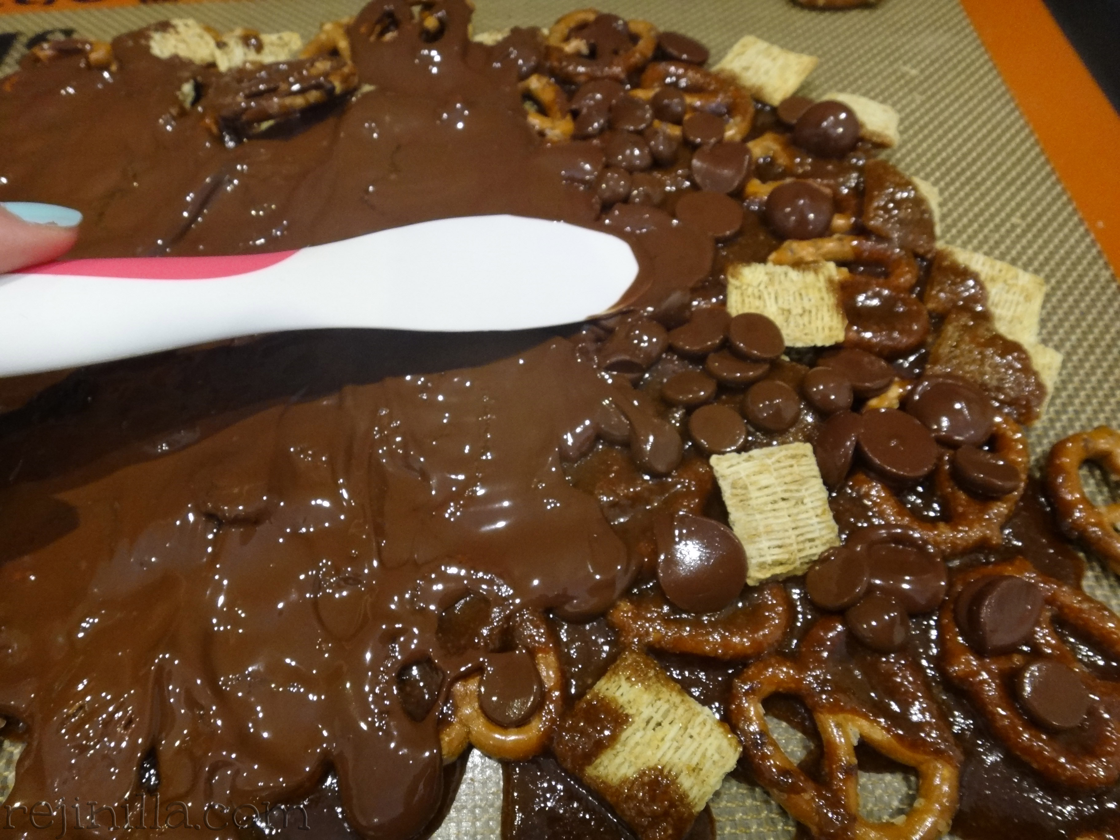 *Como los pretzels son salados no tuve que poner sal extra, si terminas usando galletas o cereal sin sal, espolvorea un poco sobre el chocolate al final.