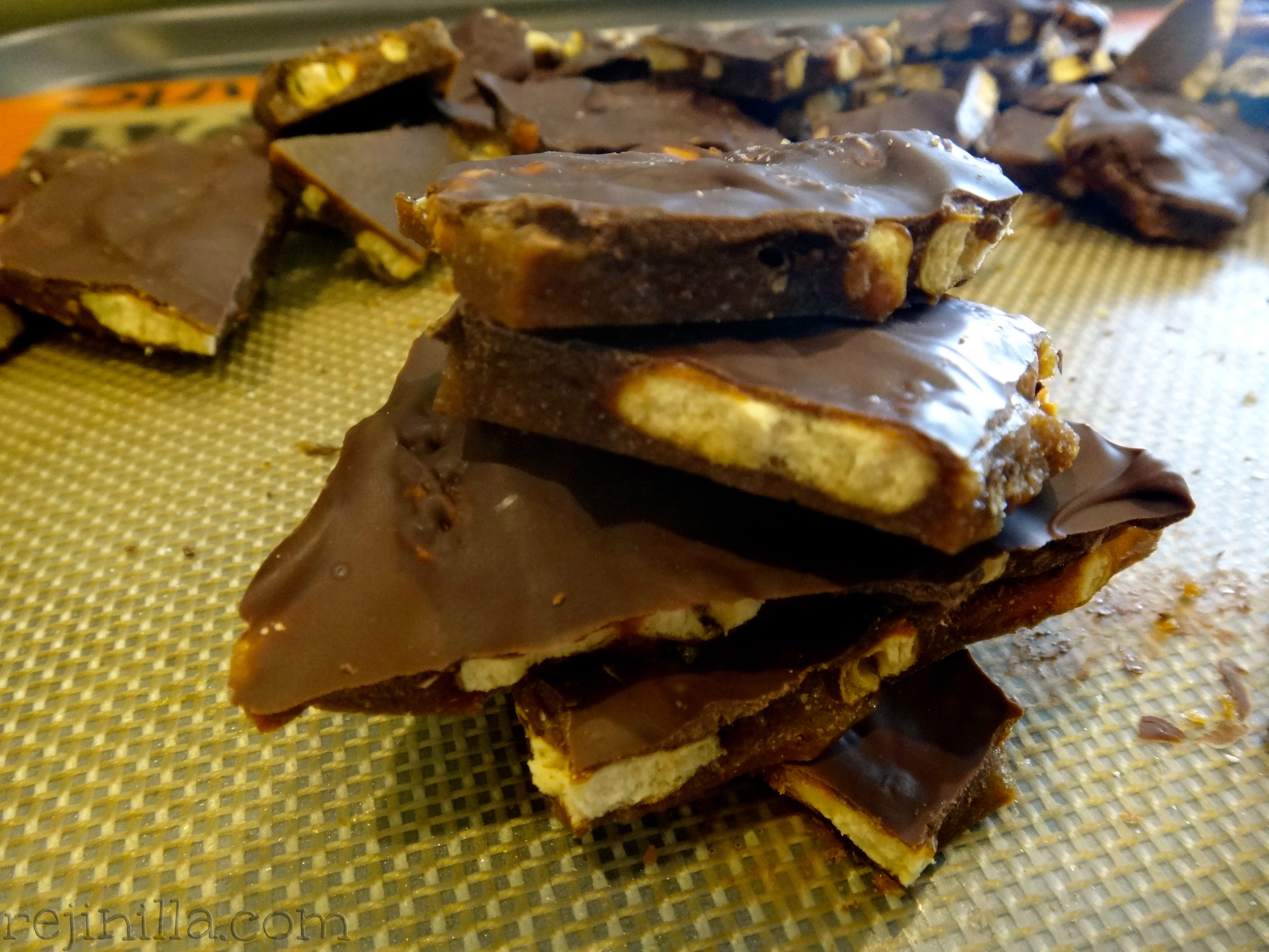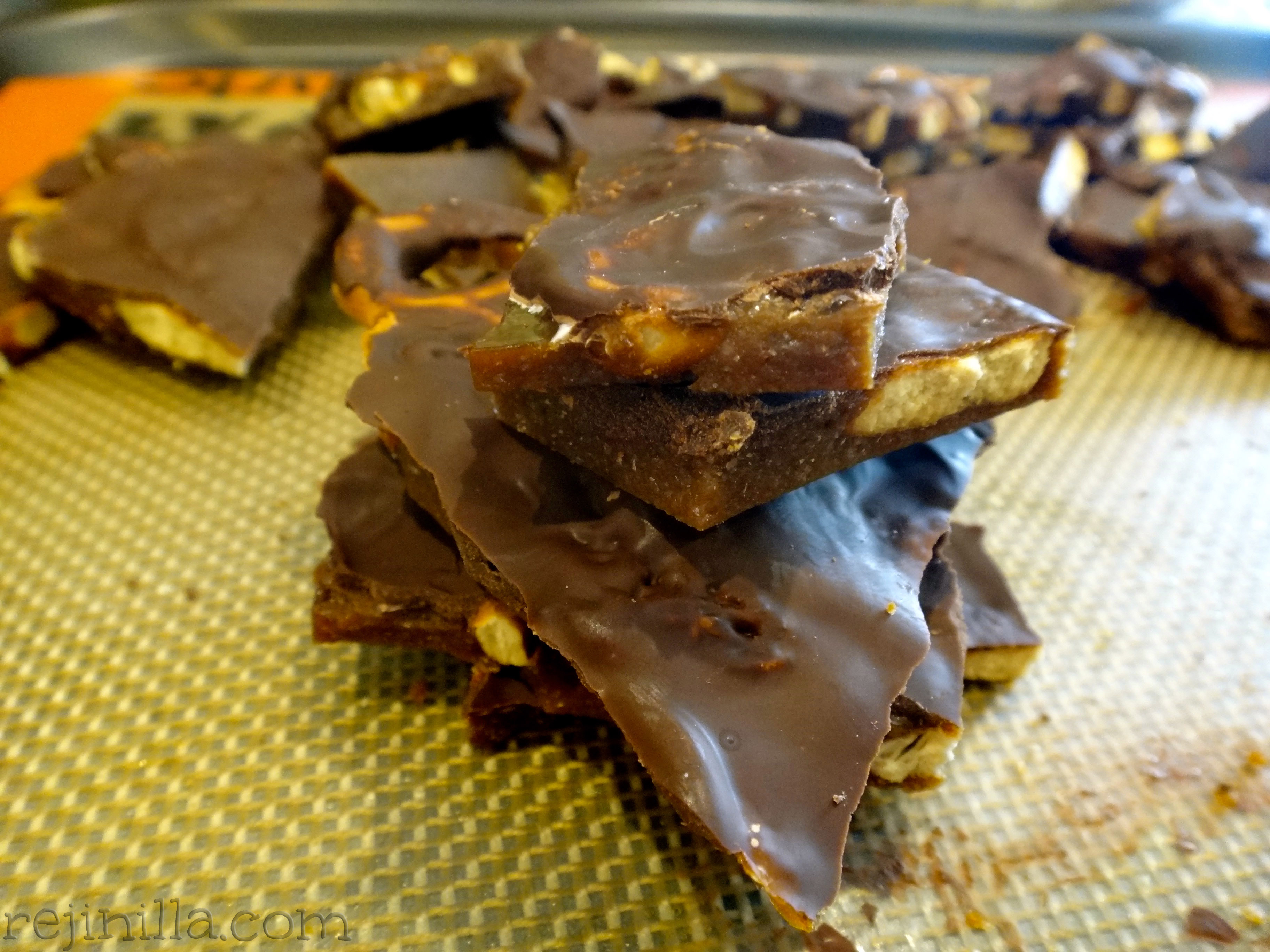 Me encanta la combinación de toffe con chocolate y algo saladito. Este dulce es adictivo y muy fácil de hacer, además parece mucho más complicado de lo que en realidad es. Otro detalle que me encanta es que le puedes poner lo que quieras que tengas en tu despensa: nueces, almendras, cereal, etc.