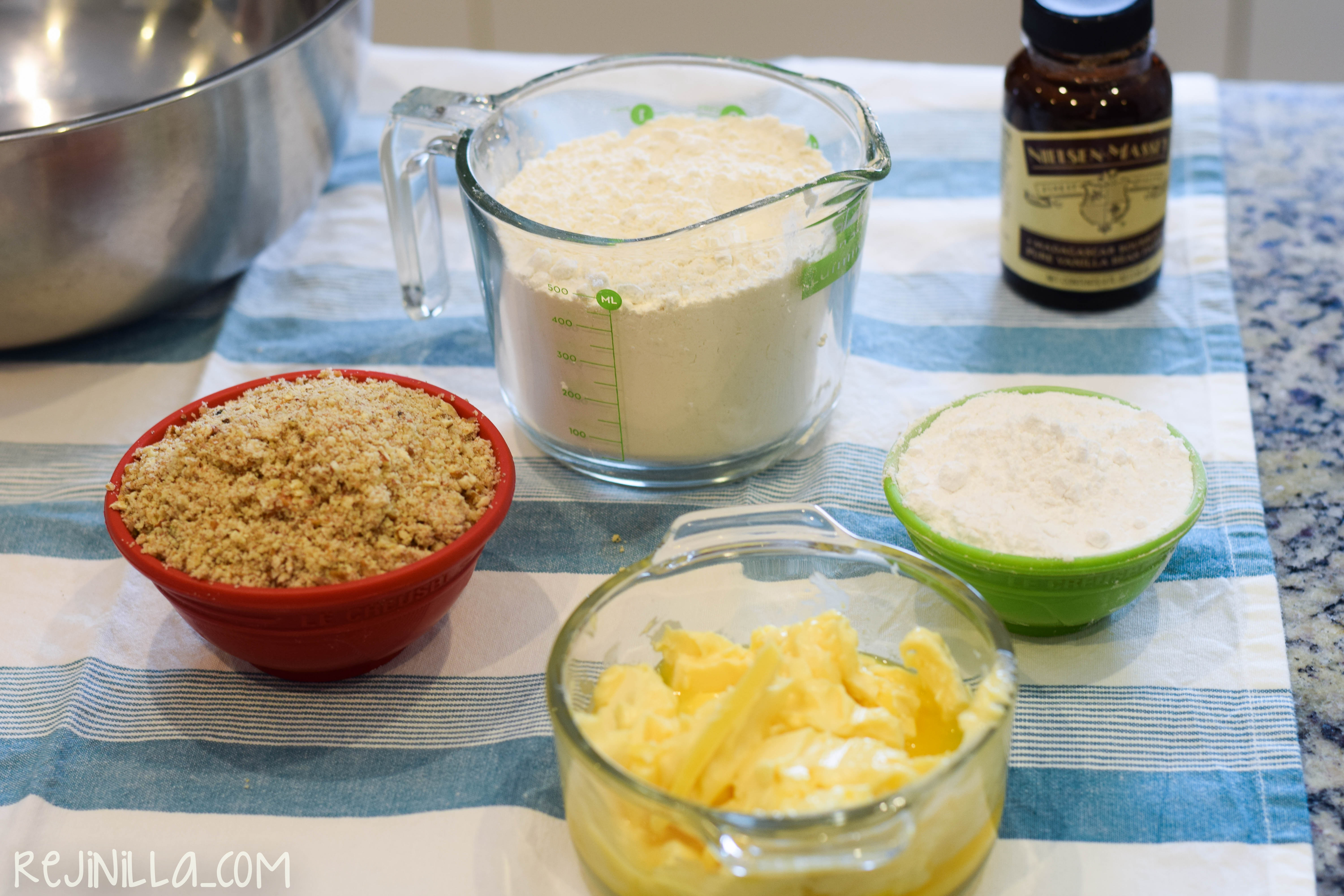**Receta adaptada de aquí.I recently made Polvorones de Nuez, also known as Mexican Wedding Cookies, although I’ve been to lots of weddings and have been given cookies like these!! These melt in your mouth and have very few ingredients, also, eggless. Start by chopping the pecans in the blender, don’t over do it or you’ll get nut butter.