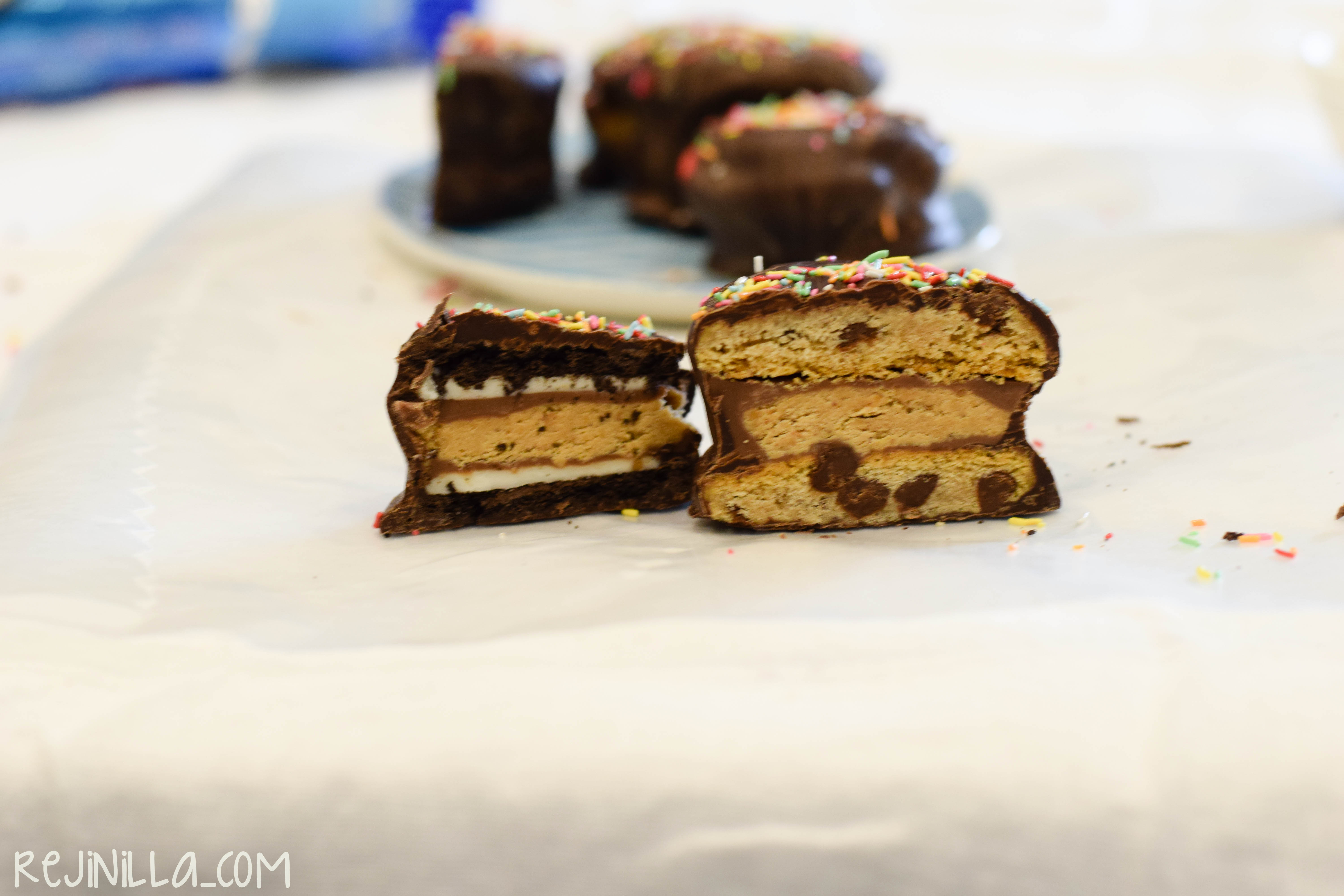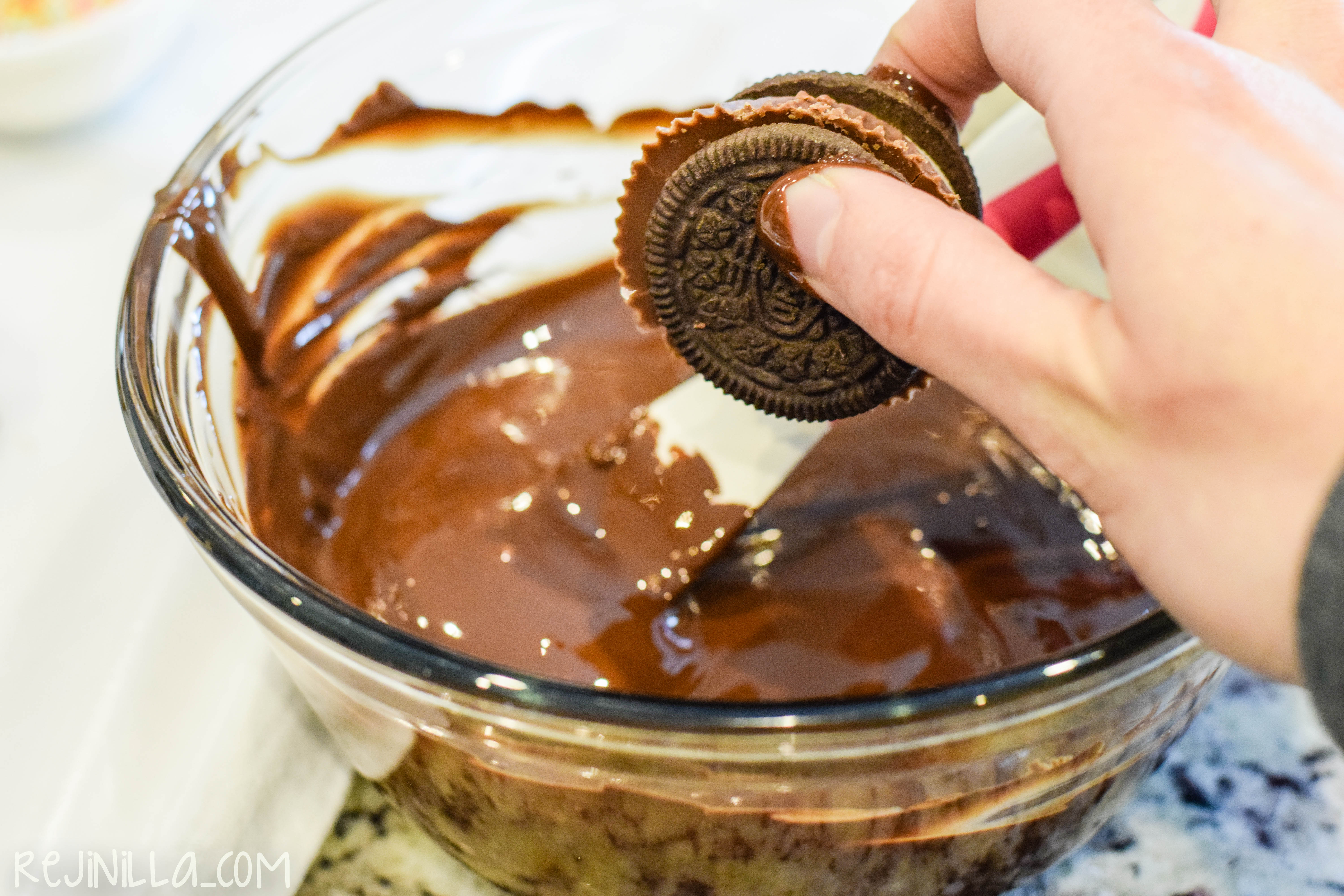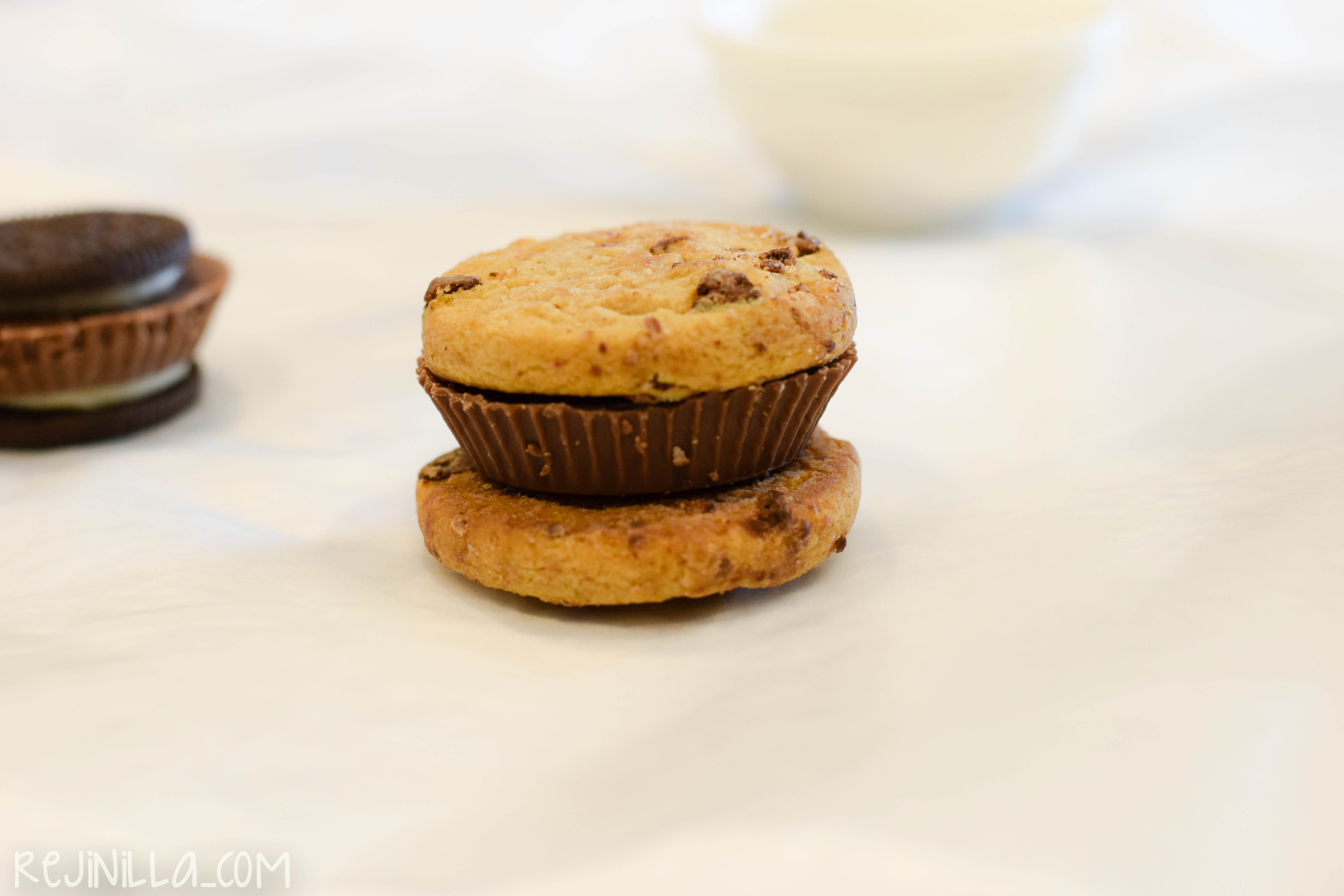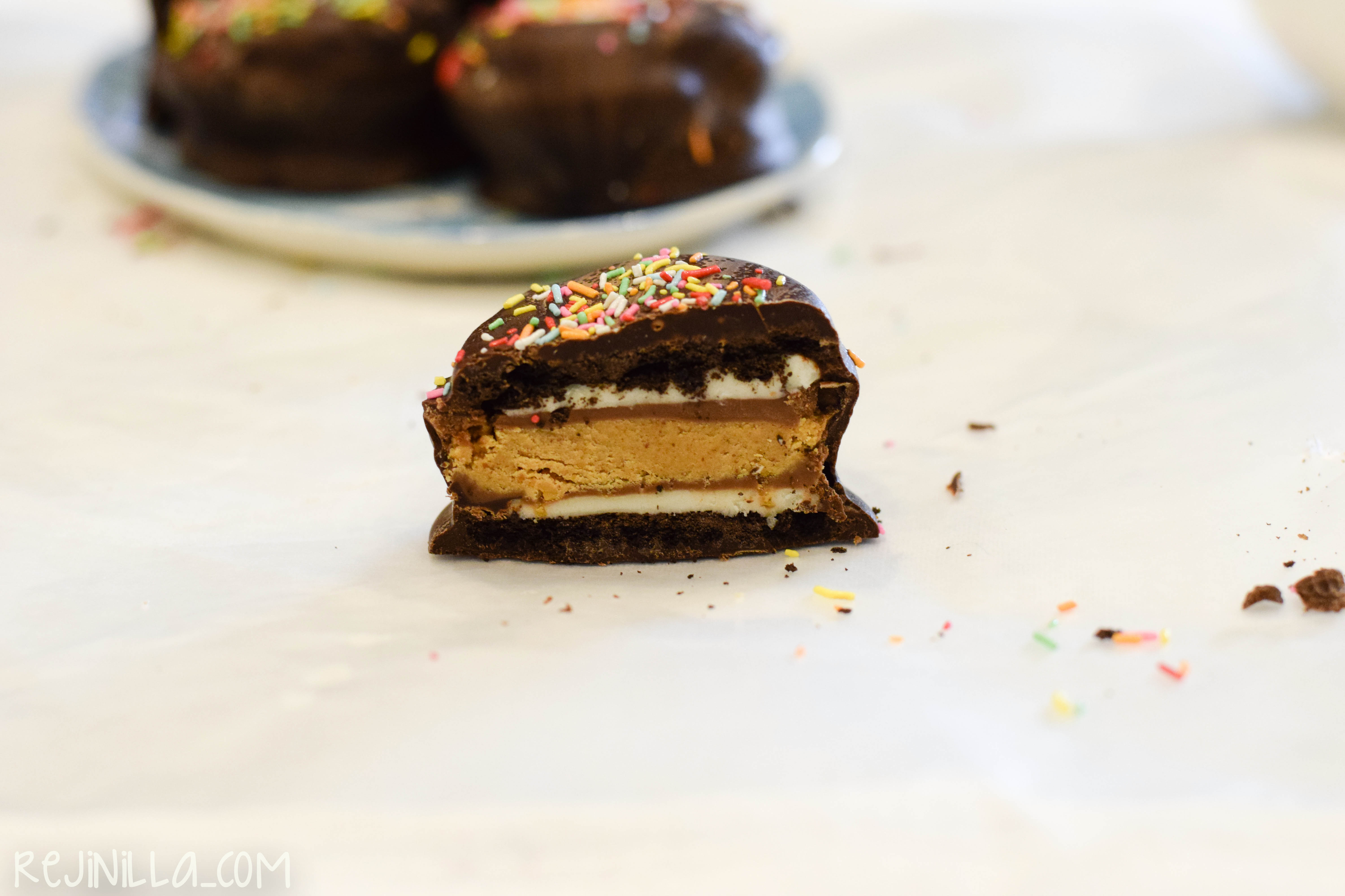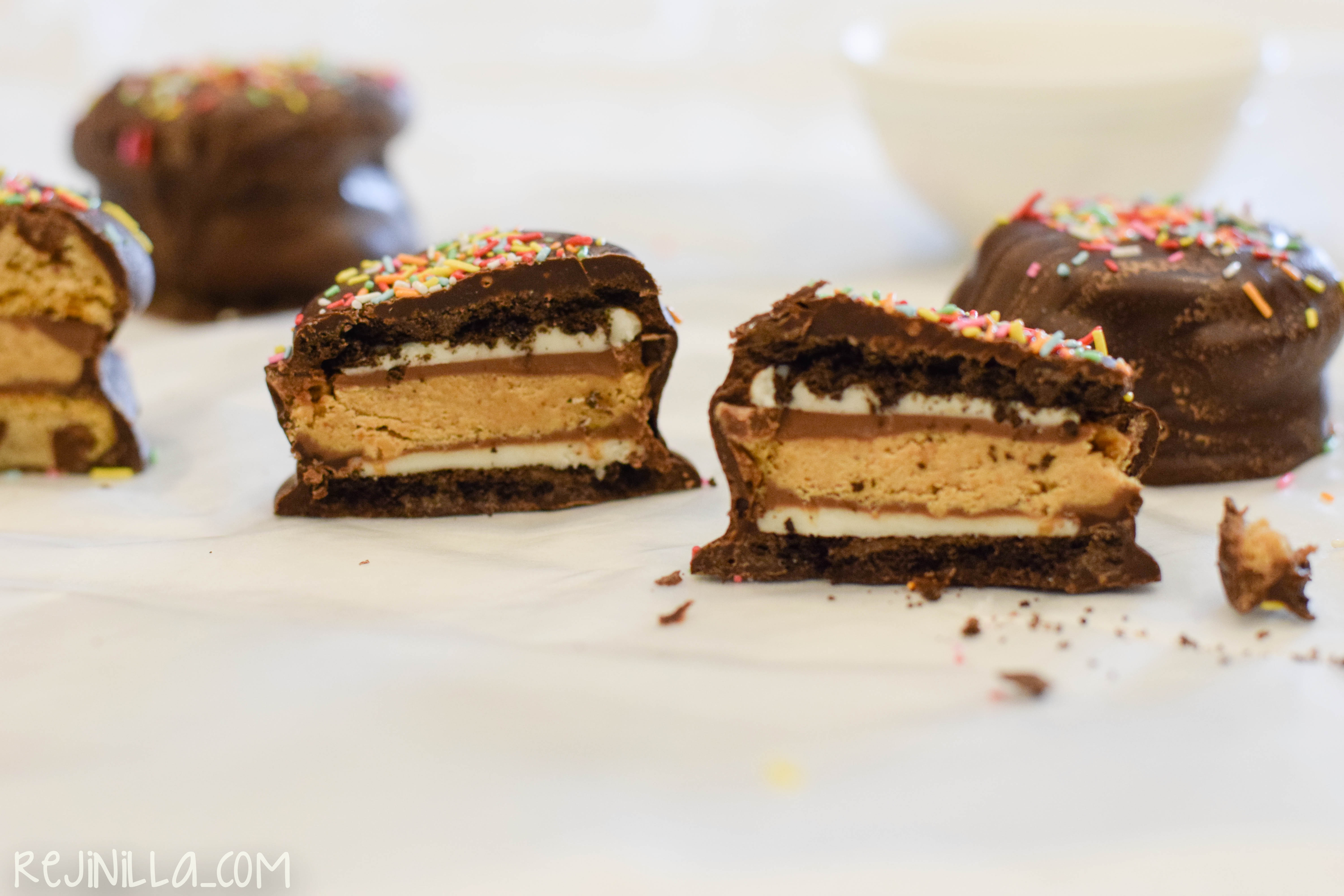 Es momento de una marranada. No hay otra palabra para describir lo que les voy a enseñar. Es una galleta Oreo (o de chispas de chocolate), con un Reese’s en el centro, todo cubierto de chocolate.galletas rellenas de pbcup-1 galletas rellenas de pbcup-2Arma los sándwiches, poniendo una parte de Oreo, un Reese’s y luego otra parte de galleta. O usando dos galletas de chispas de chocolate, con un Reese’s entre las dos. galletas rellenas de pbcup-3 galletas rellenas de pbcup-4 galletas rellenas de pbcup-5Derrite chocolate y mete los sándwiches uno por uno, que quede bien cubierto y quita el exceso. galletas rellenas de pbcup-6 galletas rellenas de pbcup-7Acomoda sobre papel encerado y deja que sequen. Un poco de chispitas no le hacen mal a nadie. galletas rellenas de pbcup-8 galletas rellenas de pbcup-9Una vista por dentro… Es una delicia! galletas rellenas de pbcup-10 galletas rellenas de pbcup-11 galletas rellenas de pbcup-12 galletas rellenas de pbcup-13