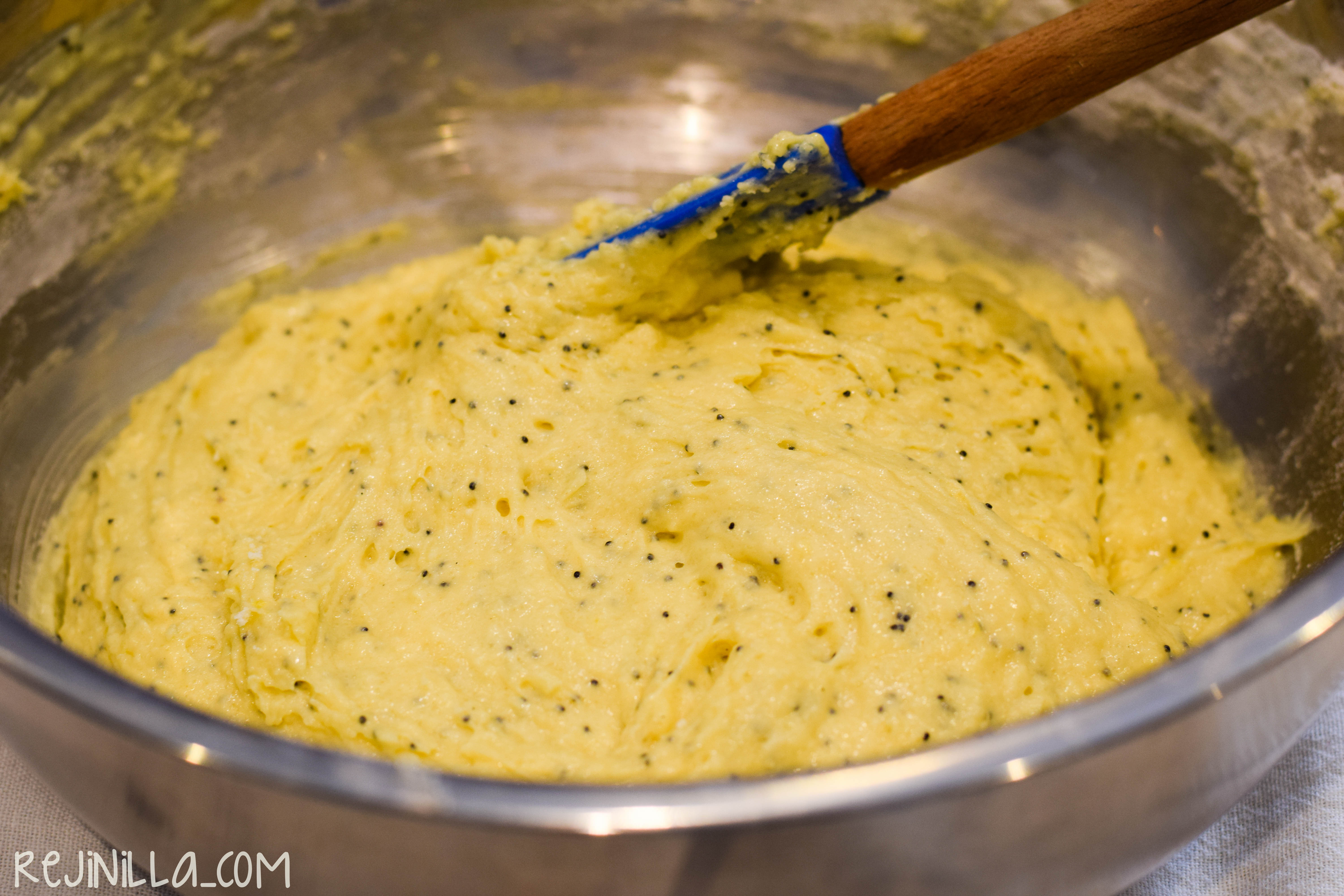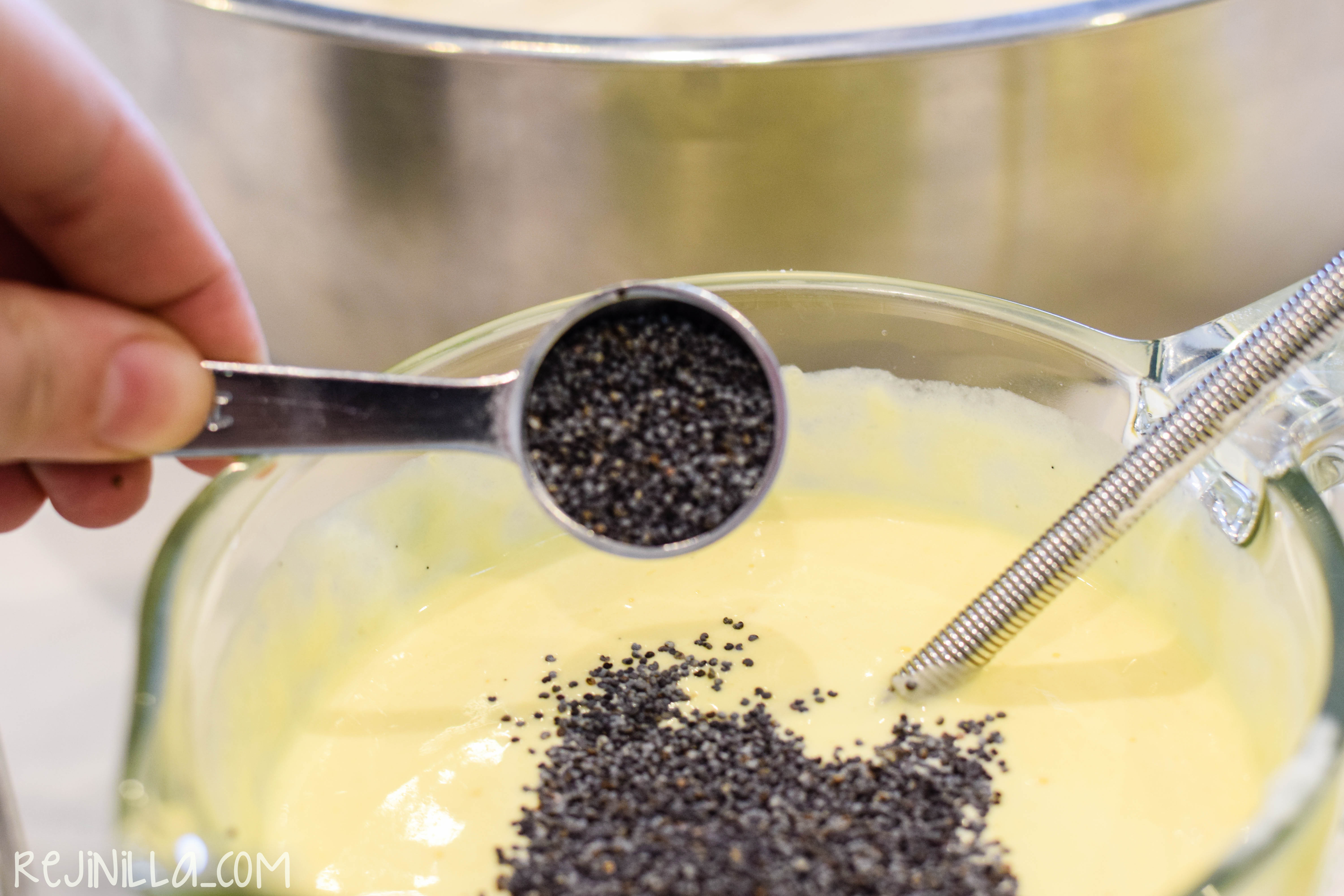 - En otro bowl, mezcla la mantequilla con el yogurt, el jugo de limón, vainilla y huevo. Agrega las semillas de amapola.