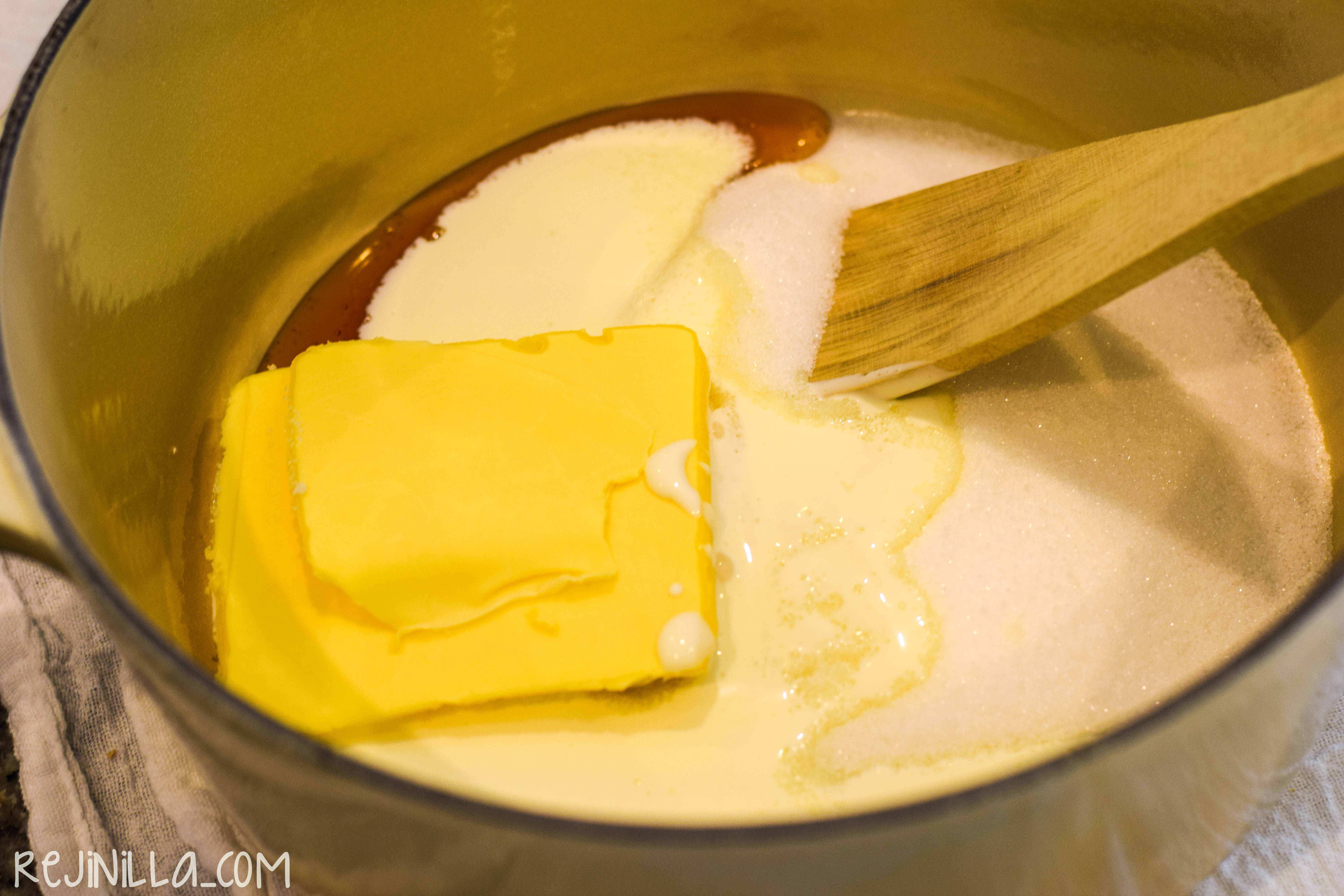 Mientras tanto, en una cacerola, pon a hervir los ingredientes húmedos, deja que burbujee y revuelve constantemente por un par de minutos. Retira del fuego y agrega los ingredientes secos. Revuelve bien y deja reposar por 30 minutos.