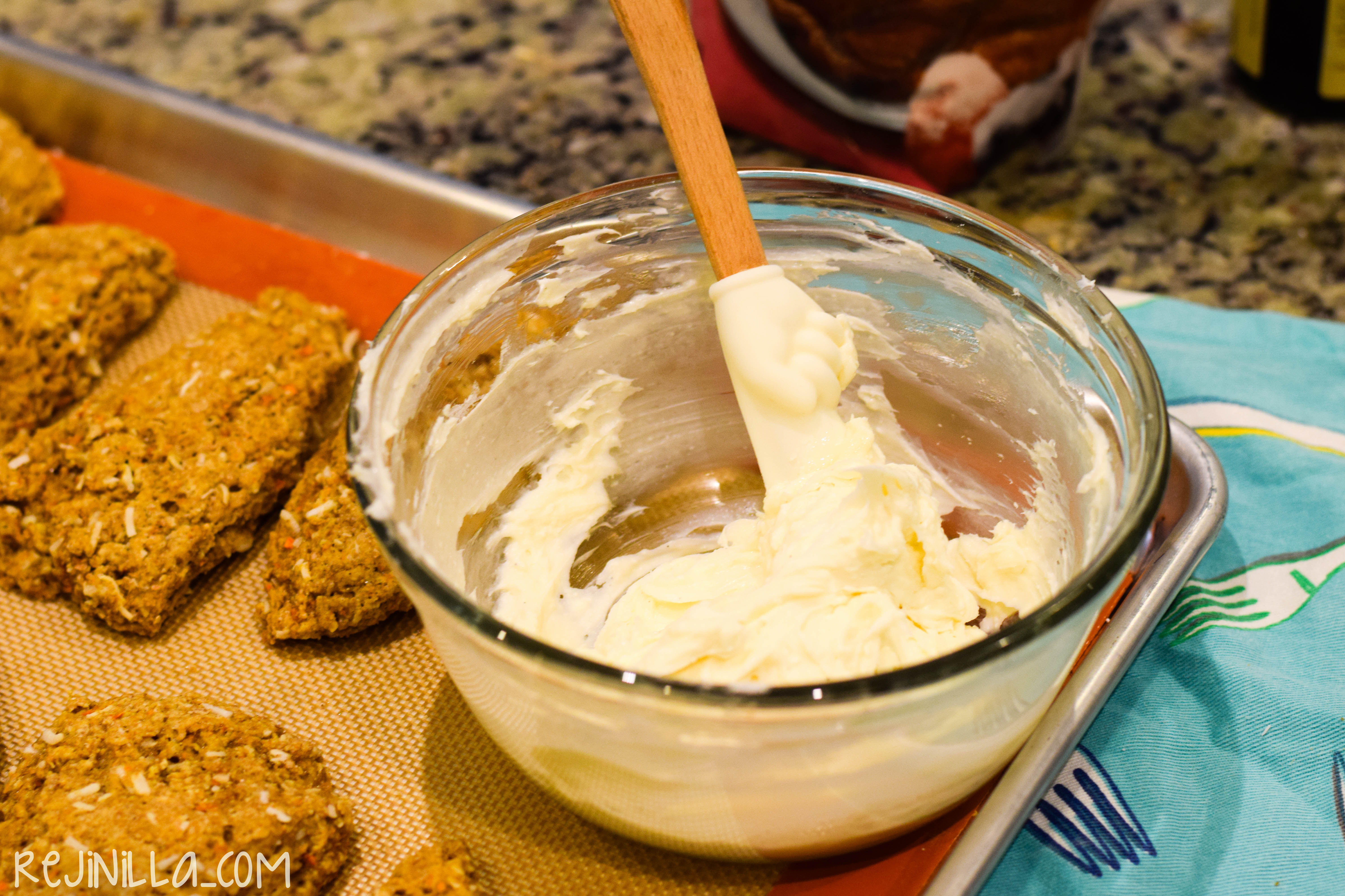 Después de 20 minutos en el horno, deja enfríar. Haz un glaseado rápido de queso crema, vainilla y azúcar.