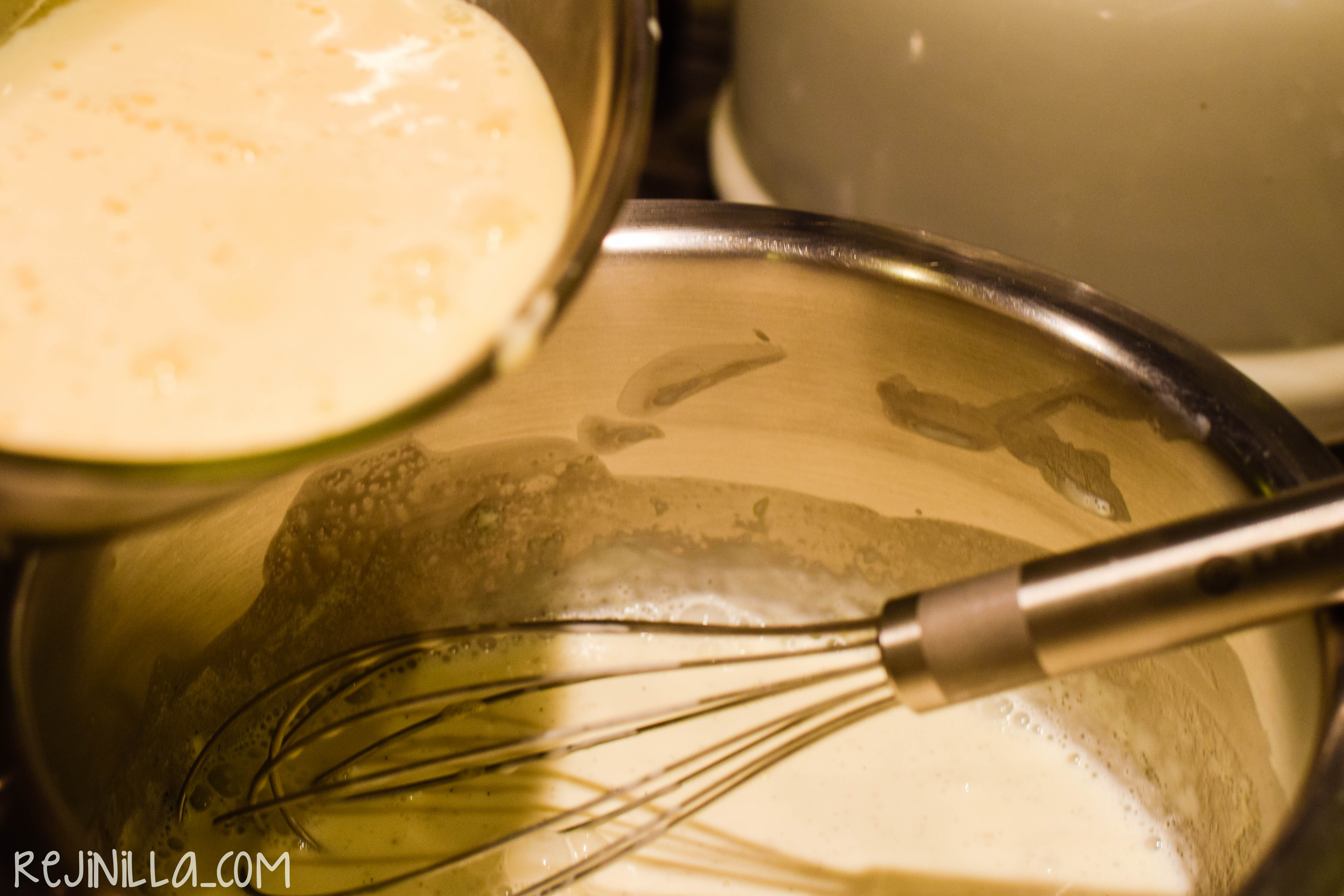 - Regresa la leche con las yemas a la cacerola y cocina revolviendo constantemente hasta que espese ligeramente la mezcla.