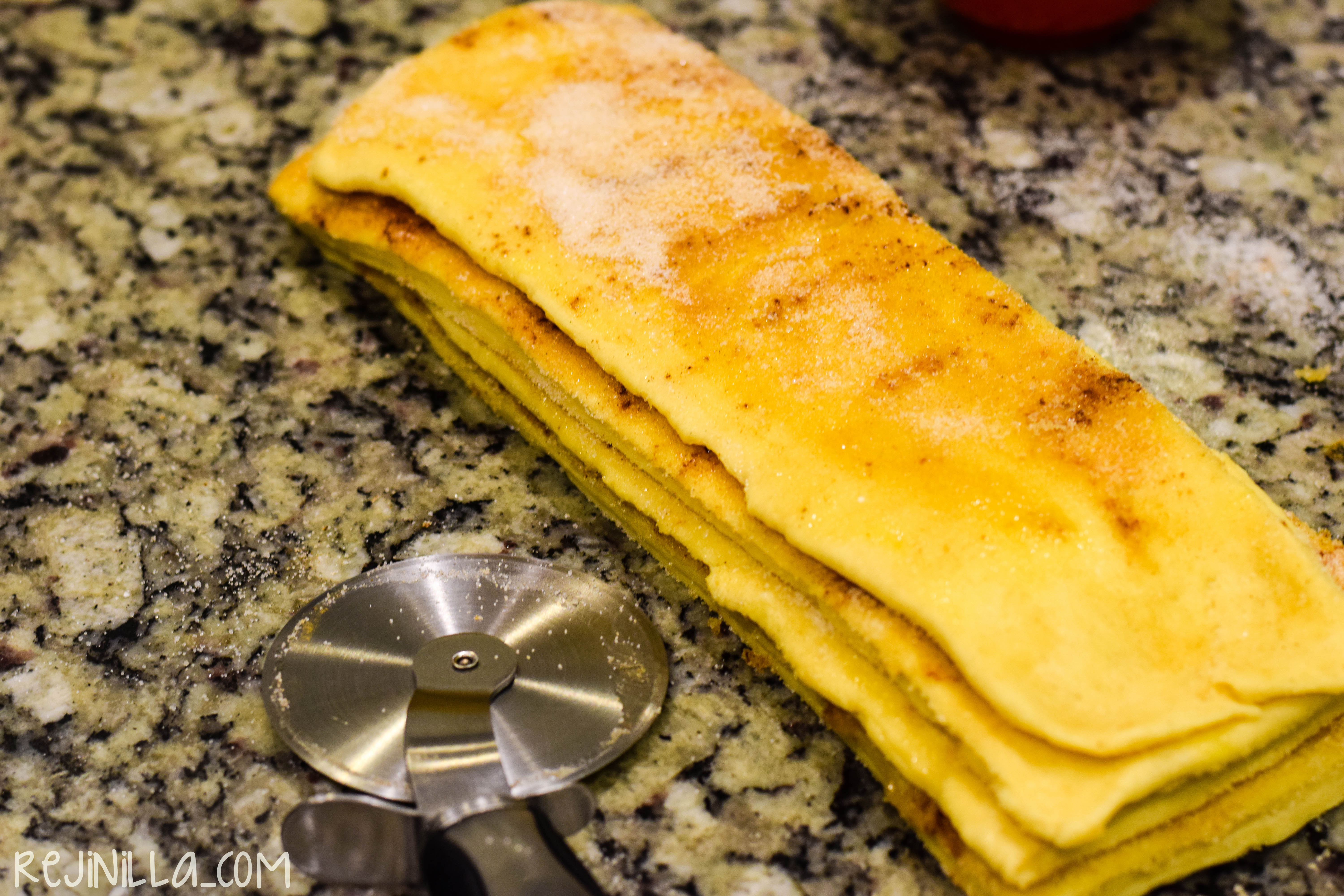 - Para armar el pan, extiende la masa para formar un rectángulo de medio centímetro. Barniza con la mantequilla, espolvorea con azúcar y canela.