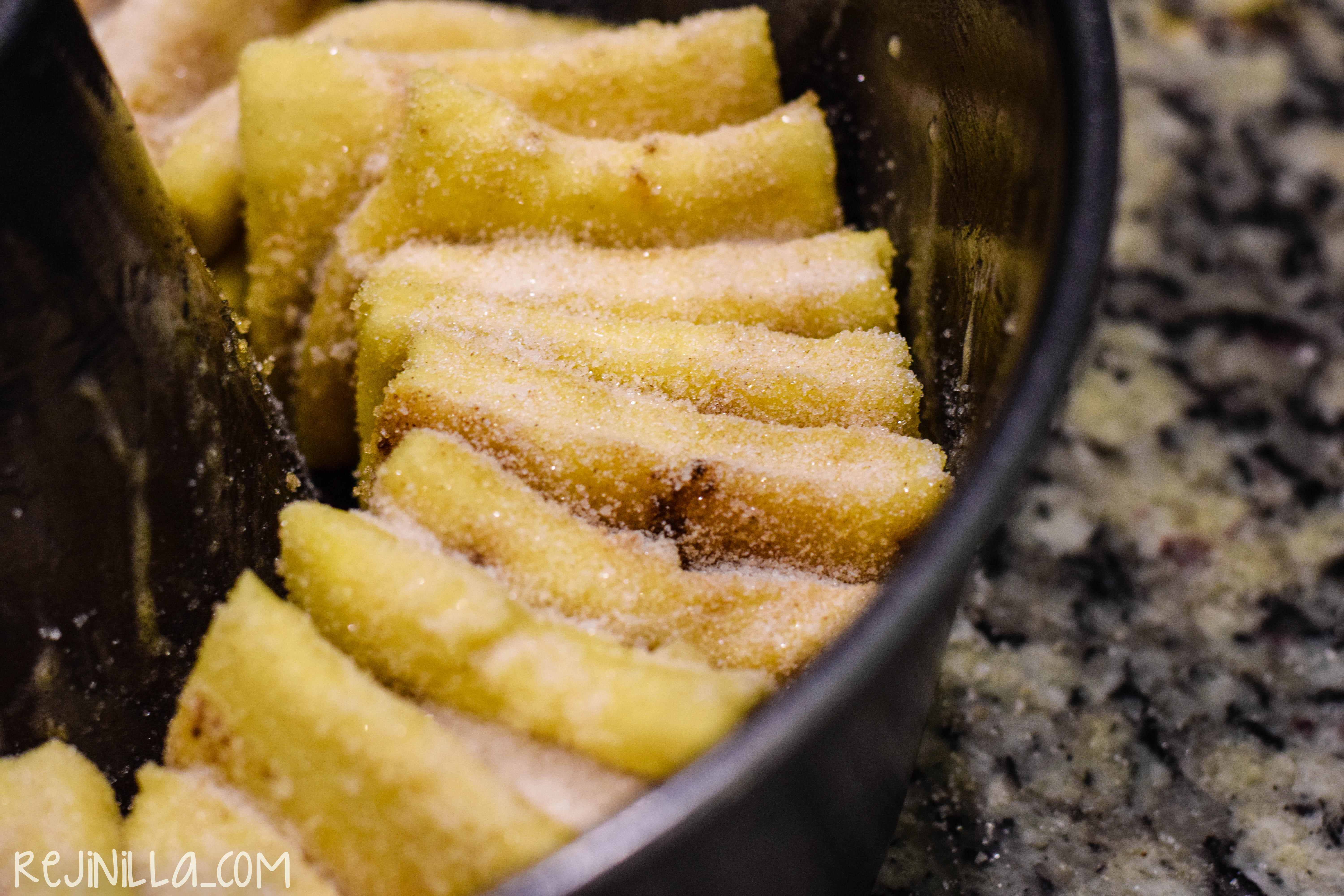 - En un molde engrasado (de rosca o de pan) acomoda las torrecitas de pan. Espolvorea un poco más de azúcar y canela.