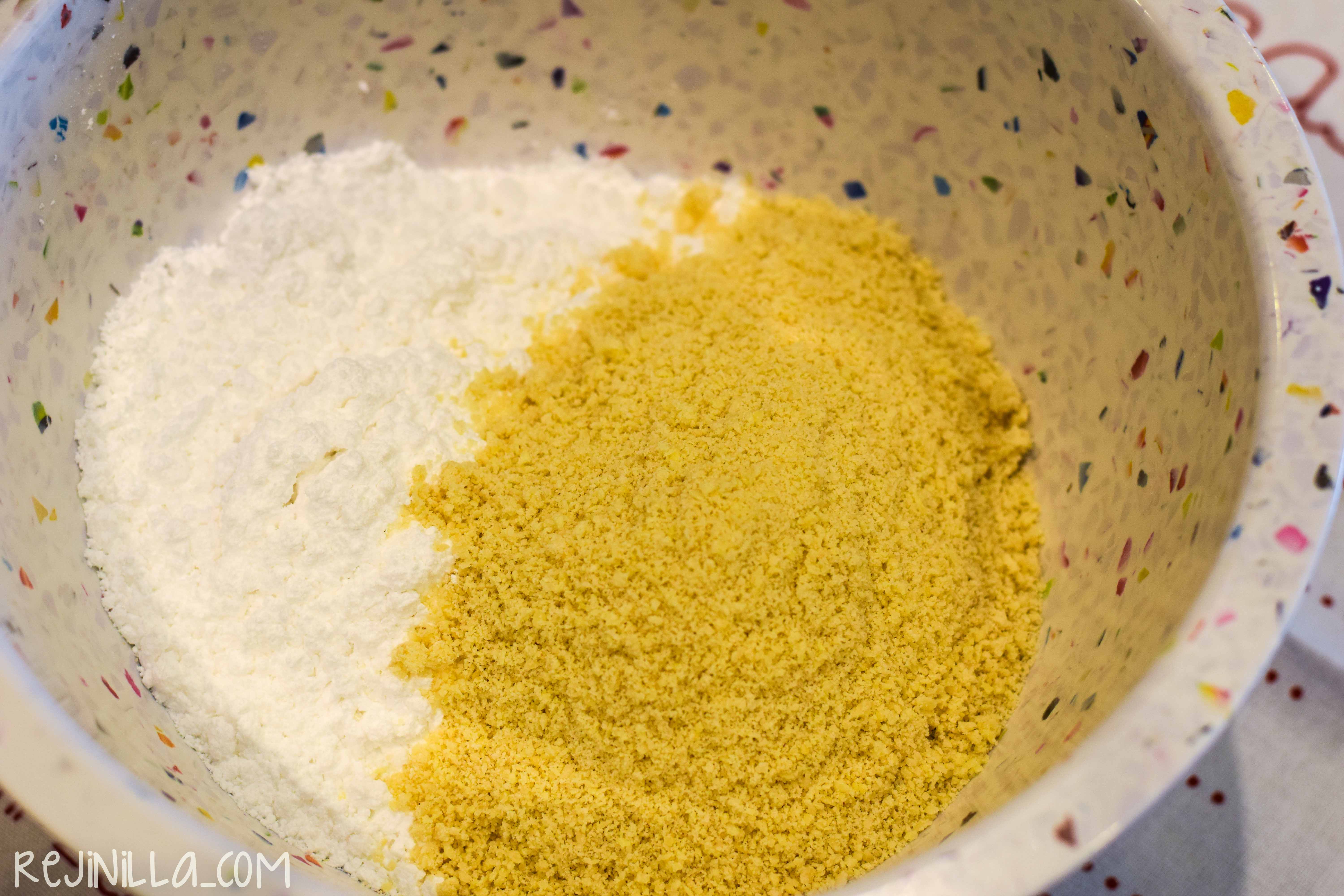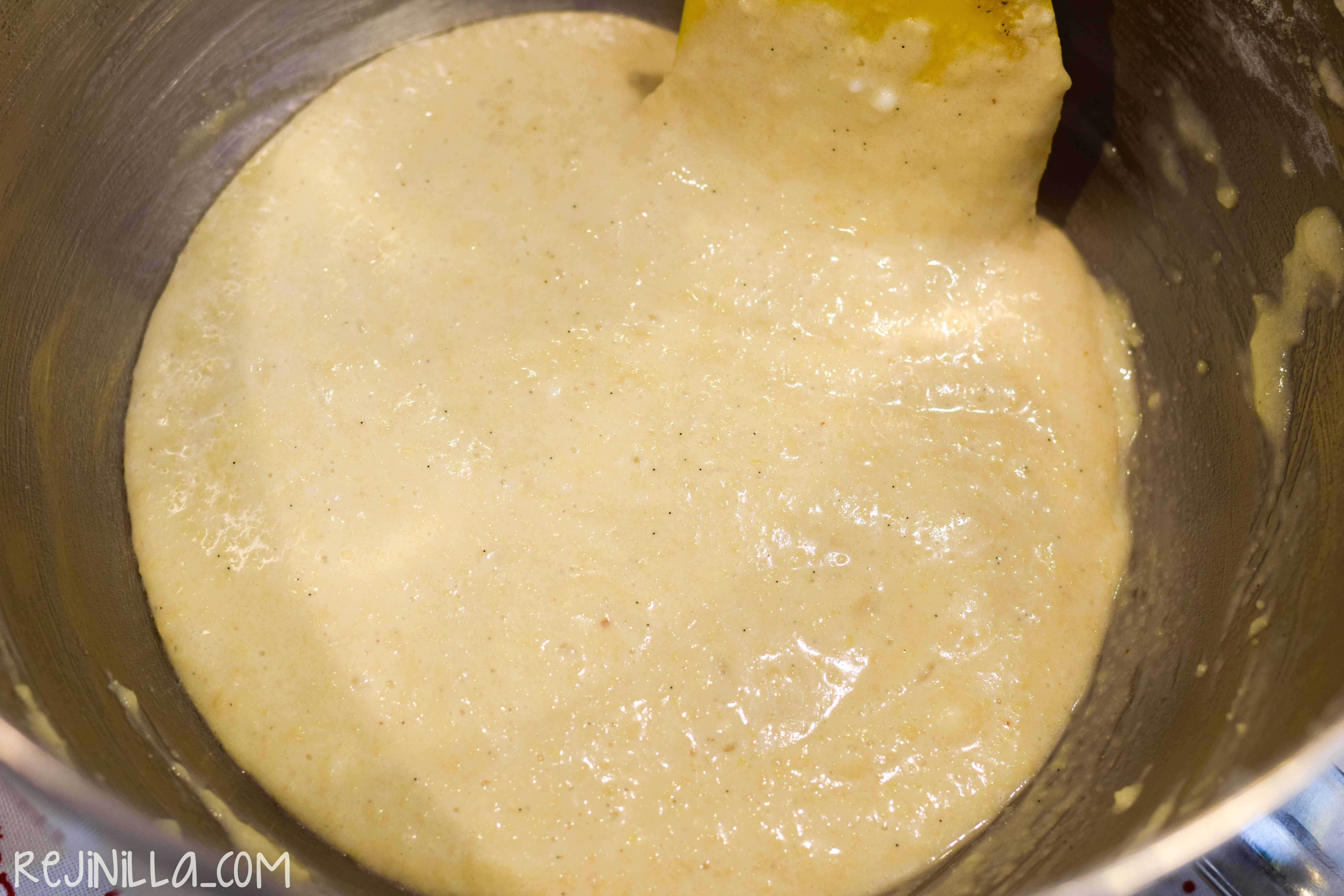 • Envuelve las claras con la mezcla de almendra y agrega las semillas de vainilla. Envuelve sólo para integrar, como 10-15 vueltas máximo. Al hacer una línea al centro, esta debe desaparecer en 10 segundos. Si se tarda más, dale una vuelta más.