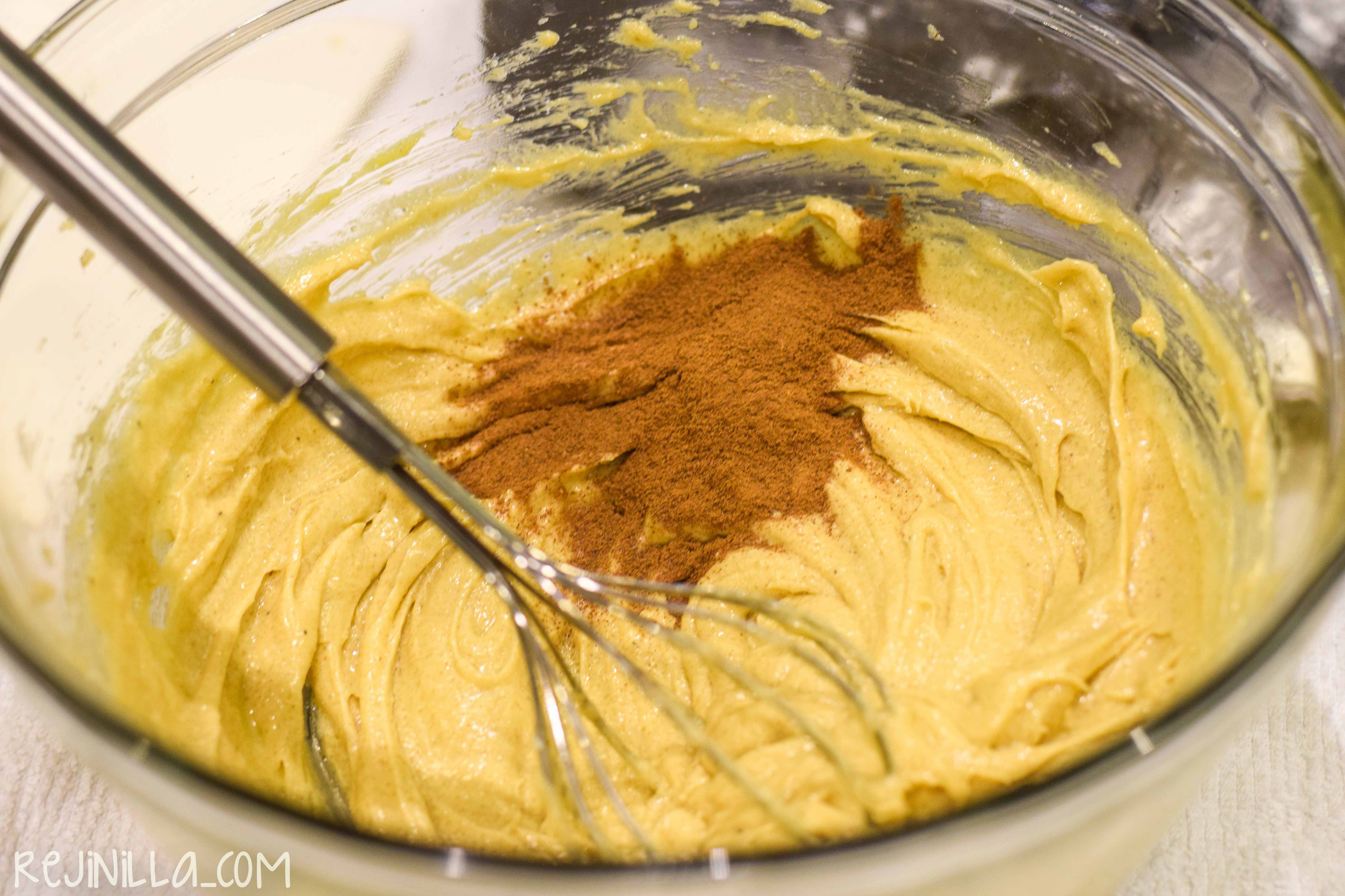 Empieza batiendo a mano mantequilla a medio derretir (es un paso de floja, la verdad, pero es muy práctico y funciona). Usa un globo y bate junto con el azúcar. Agrega la canela y el huevo.
