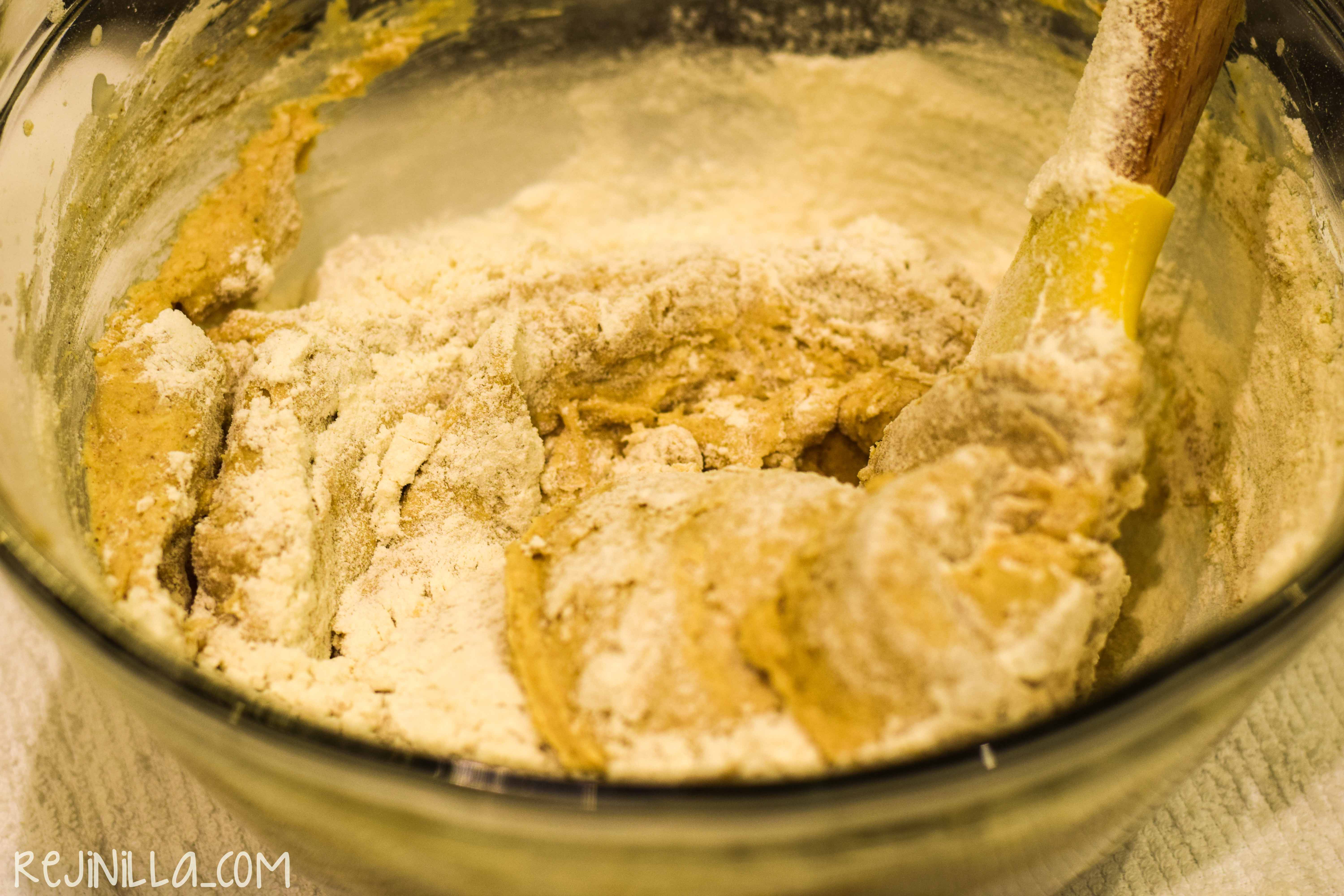 Después agrega la mitad de los ingredientes secos, cernidos, y con una pala, envuelve.