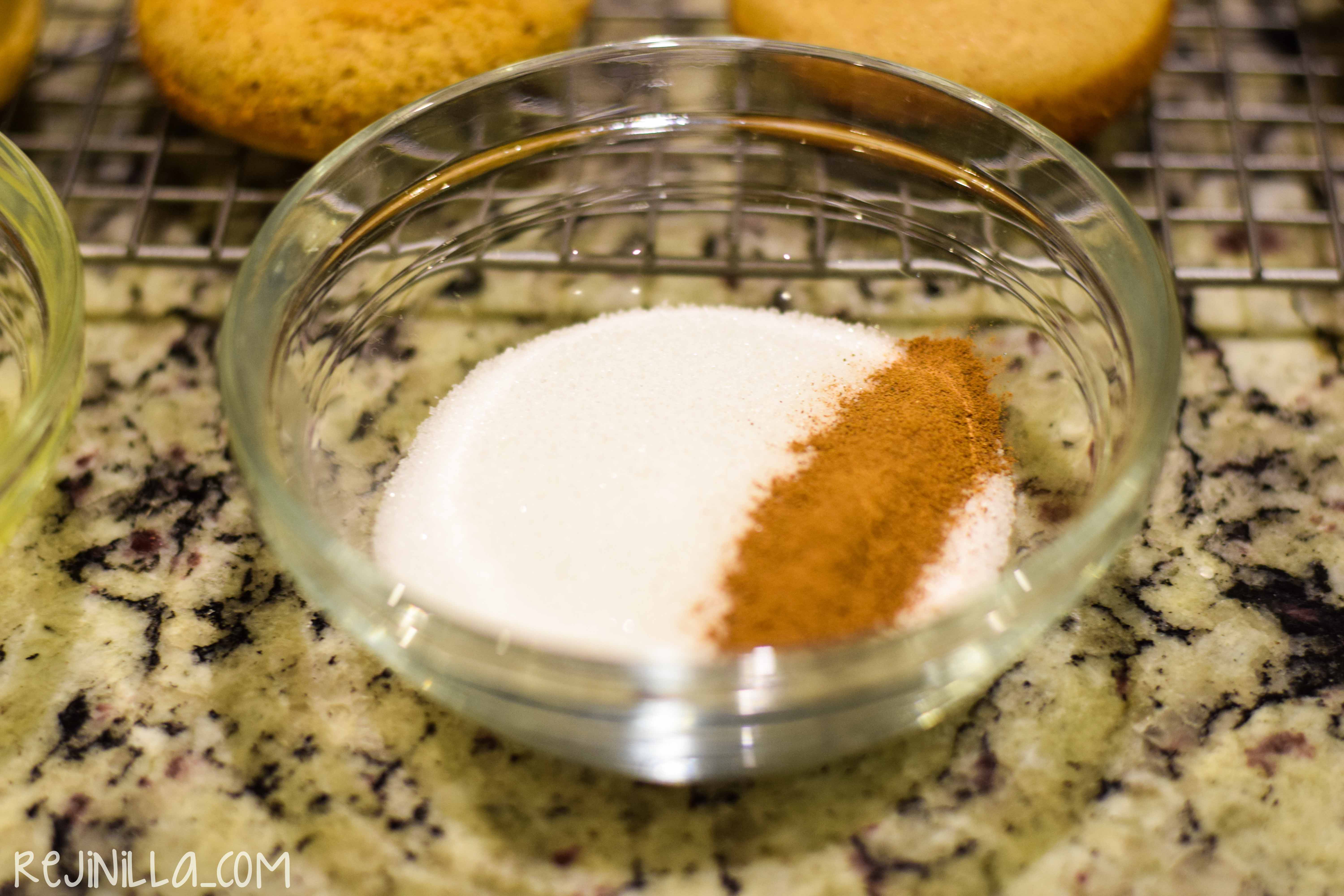 Recién salidos del horno, pasa por una mezcla de azúcar y canela, o si quieres el verdadero treat engordador – =) – barniza con un poco de mantequilla derretida antes de tapizar con azúcar y canela. Yuumy!