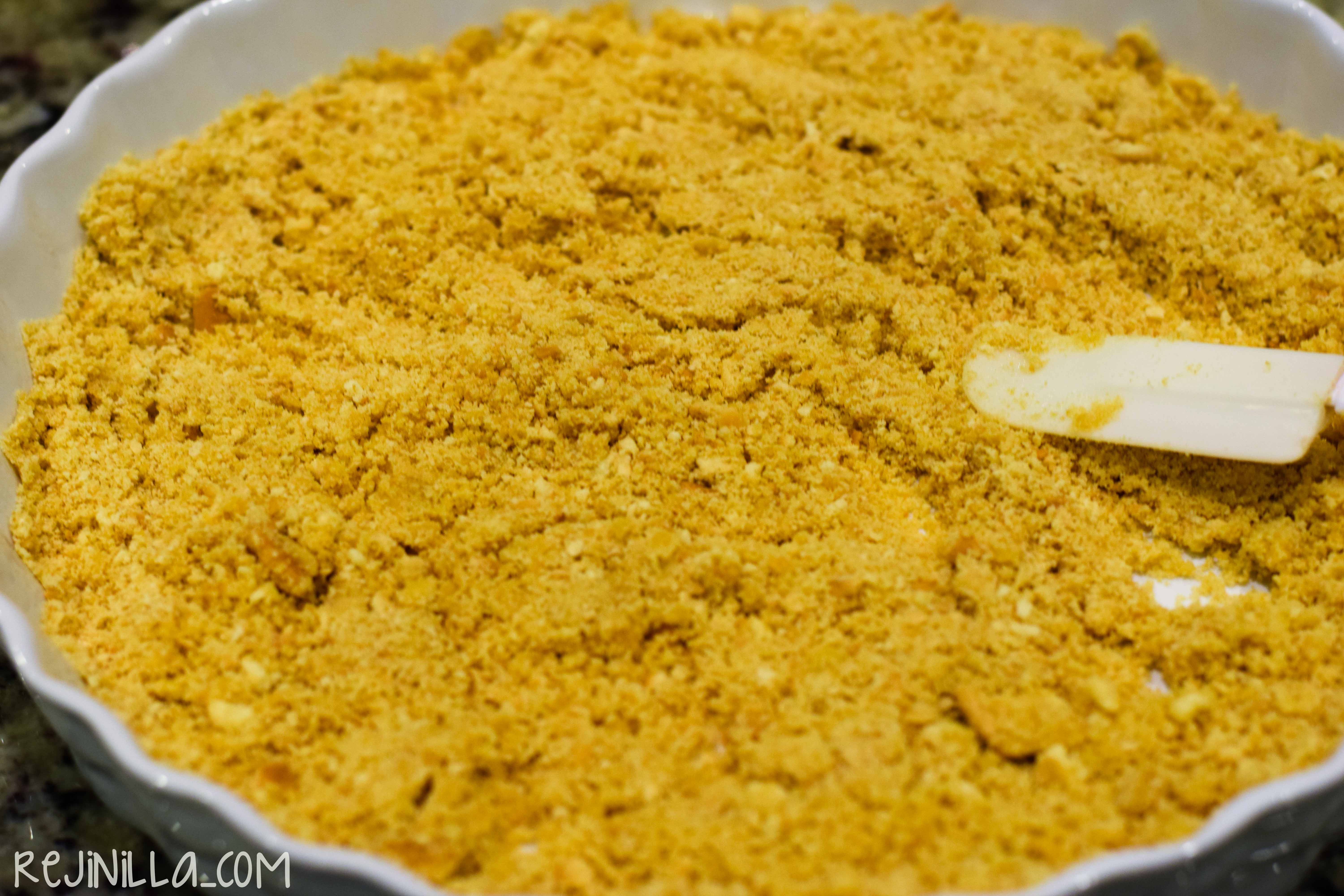 Empieza moliendo las galletas en el procesador o licuadora o bajo un rodillo enojado. Separa dos cucharadas y aplasta el resto en un molde junto con la mantequilla y hornea por 10 minutos, deja enfriar.