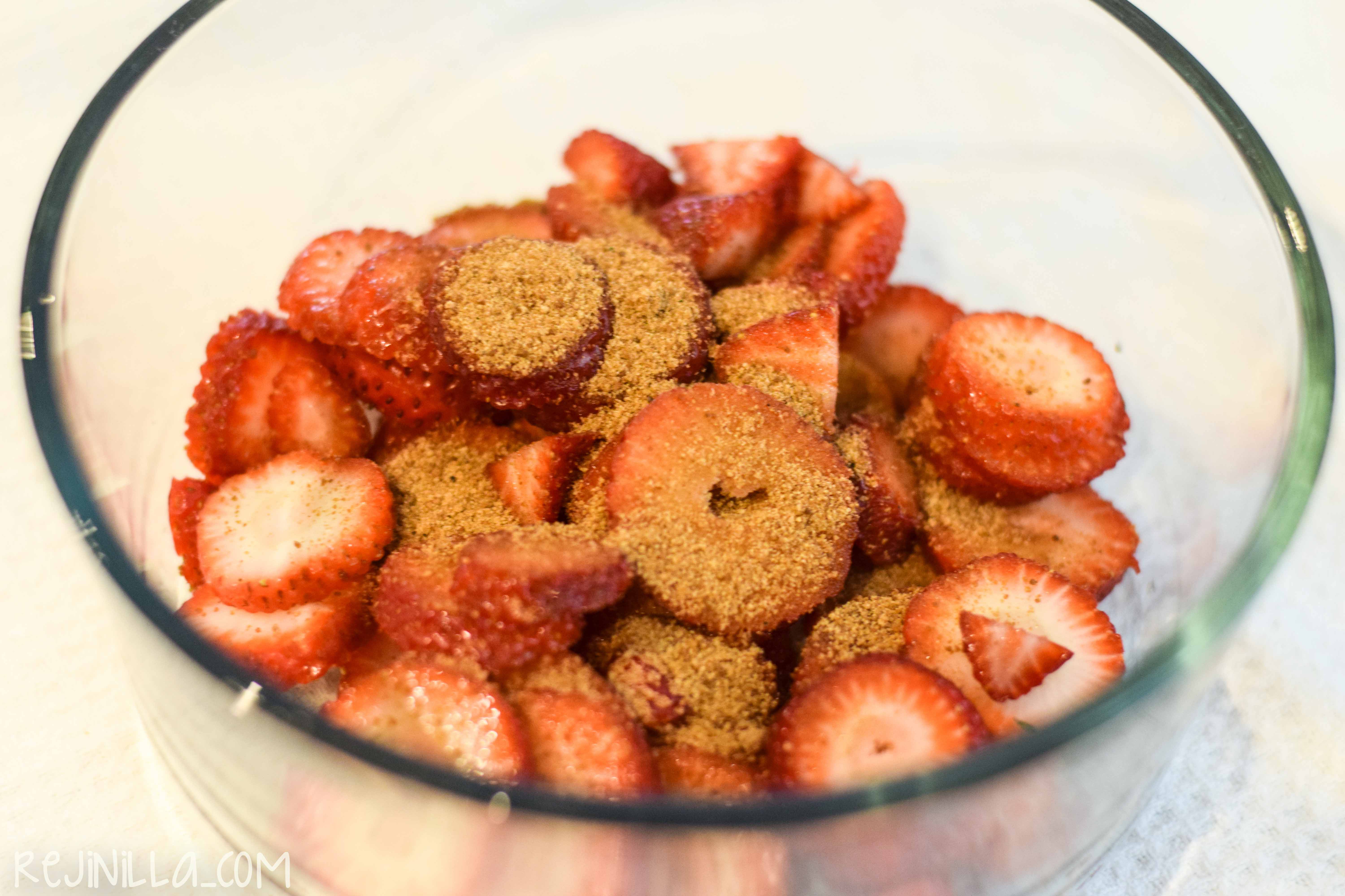 20 minutos antes de la hora de servir, corta las fresas en rebanadas y mezclalas con un poco de tu endulzante, yo volví a usar azúcar de coco y la vuelvo a recomendar, déjalas a que suelten un poco de su jugo.