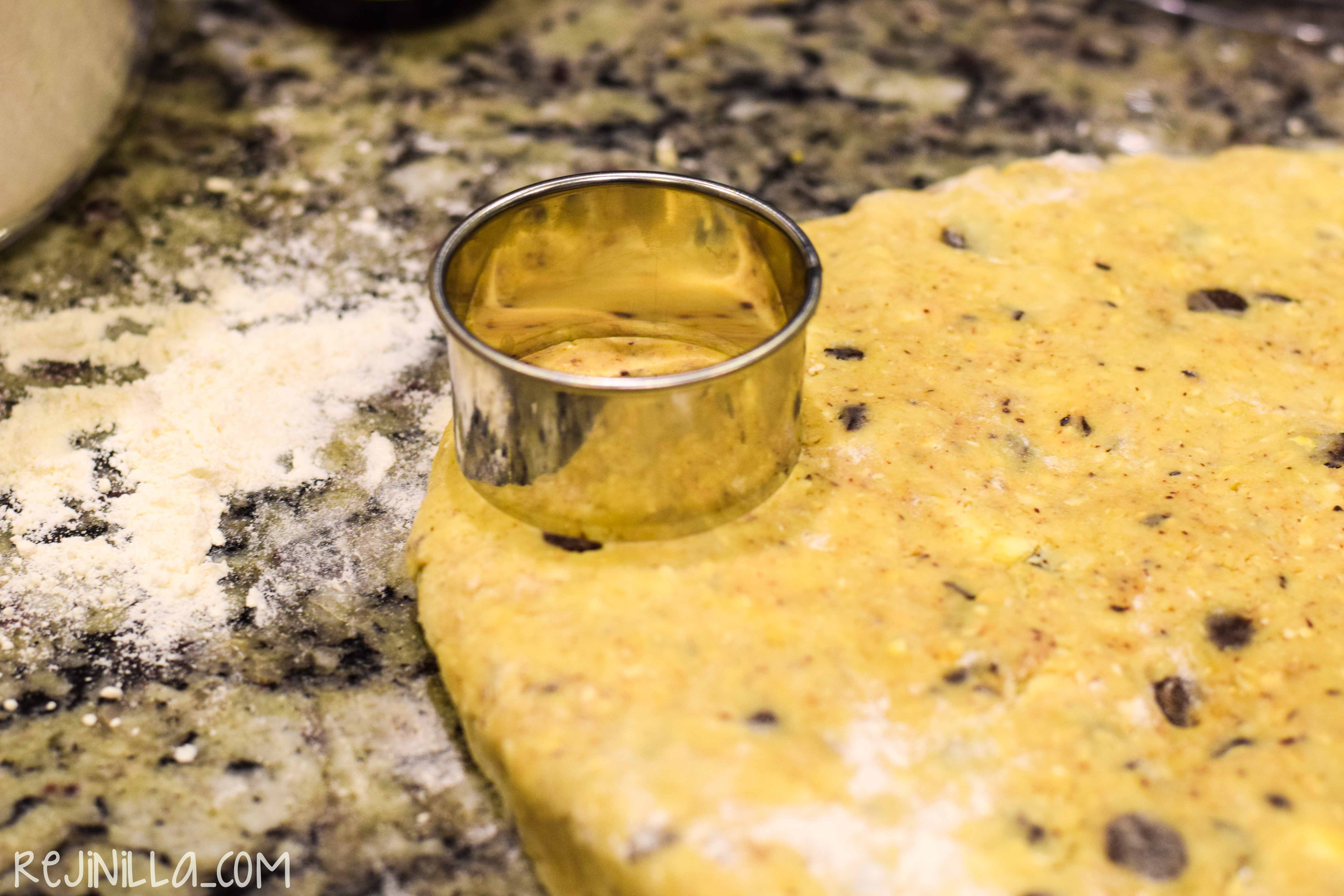 Estira la masa con un poco de harina y con un rodillo o con las manos para que quede como de 3-4cm de espesor. Corta en tríangulos, cuadrados o como yo esta vez, círculos.