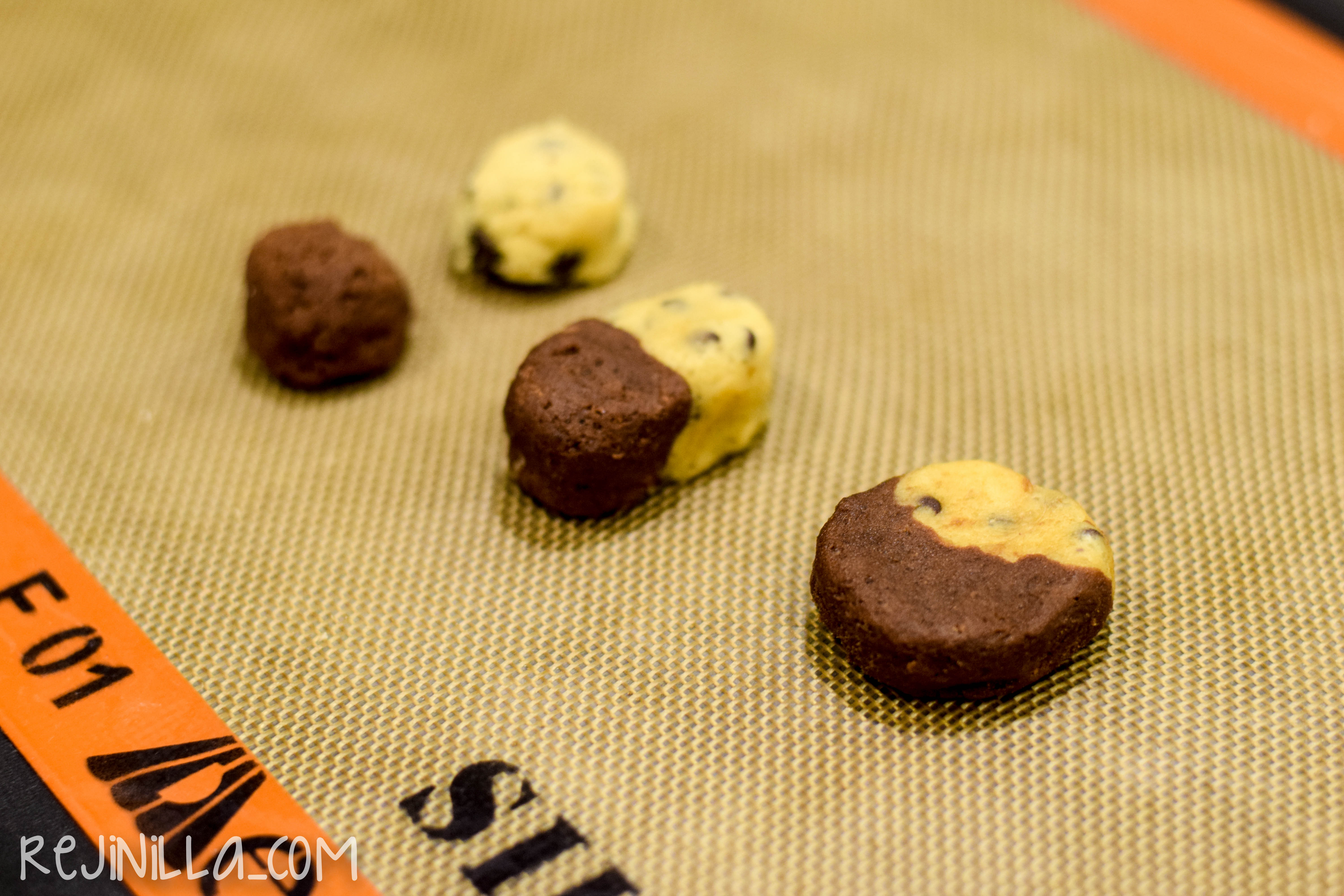 - Haz bolitas con cada masa, las bolitas de chispas de chocolate podrían ser un poco más grandes. Junta las bolitas para formar discos con los dos sabores. No aplanes de más.