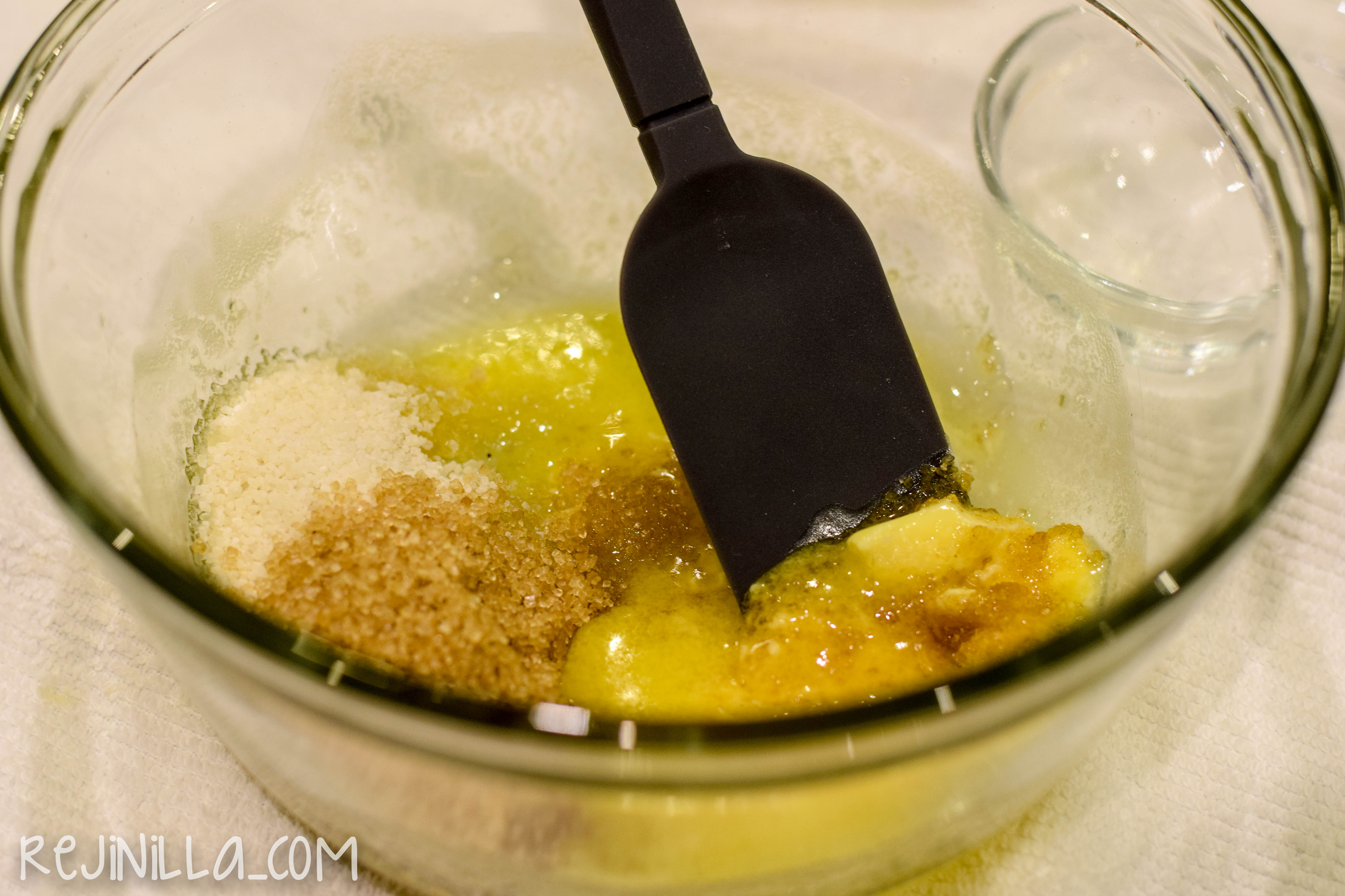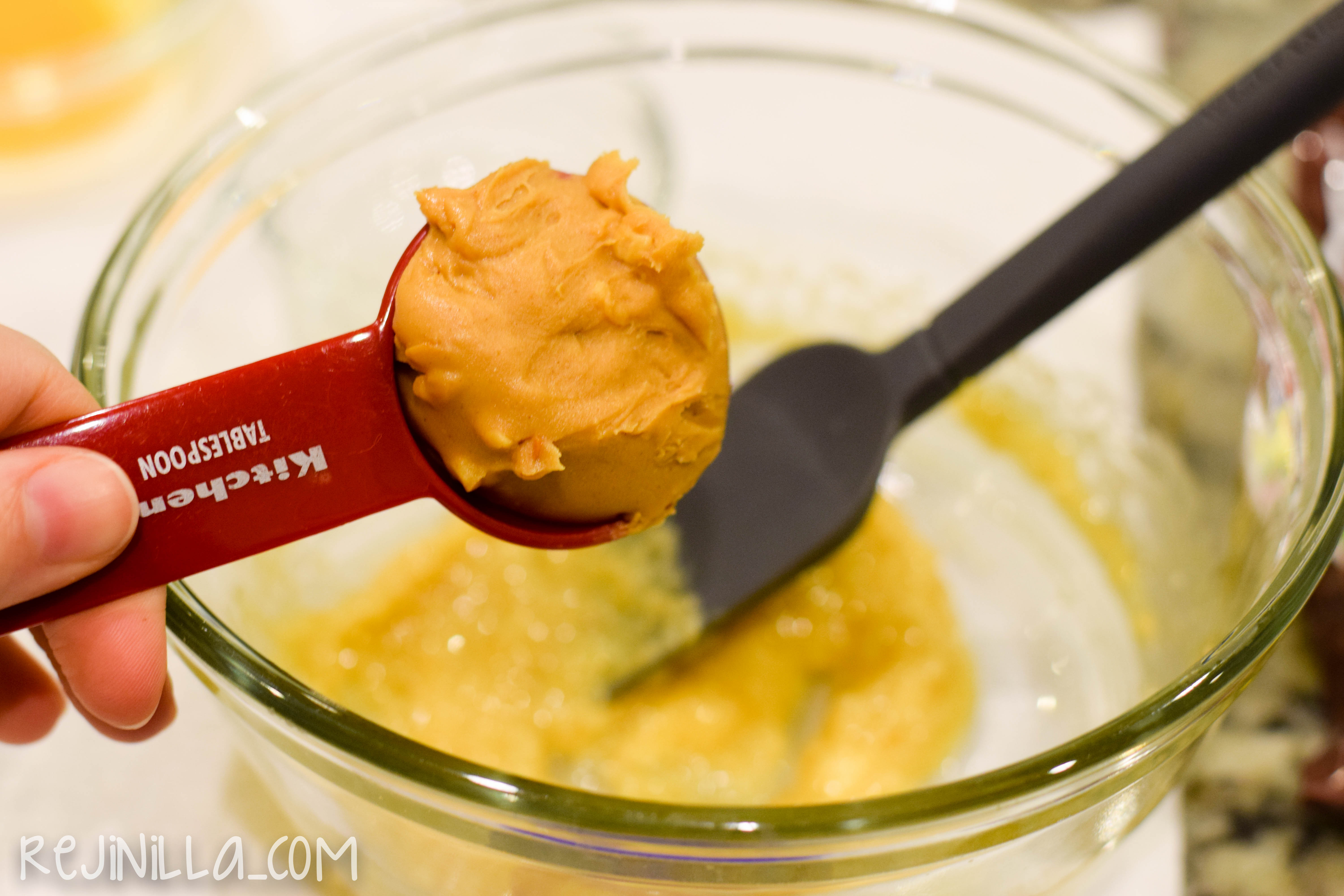 Empieza mezclando mantequilla suavizada o casi derretida, azúcar, vainilla y la crema de cacahuate (yo tenía con chunks, usa la que tengas por ahí). También necesitas dos cucharadas de huevo batido, eso suena complicado, pero bate un huevo, mide las dos cucharadas y el resto guárdalo en el refrí para el desayuno de mañana.