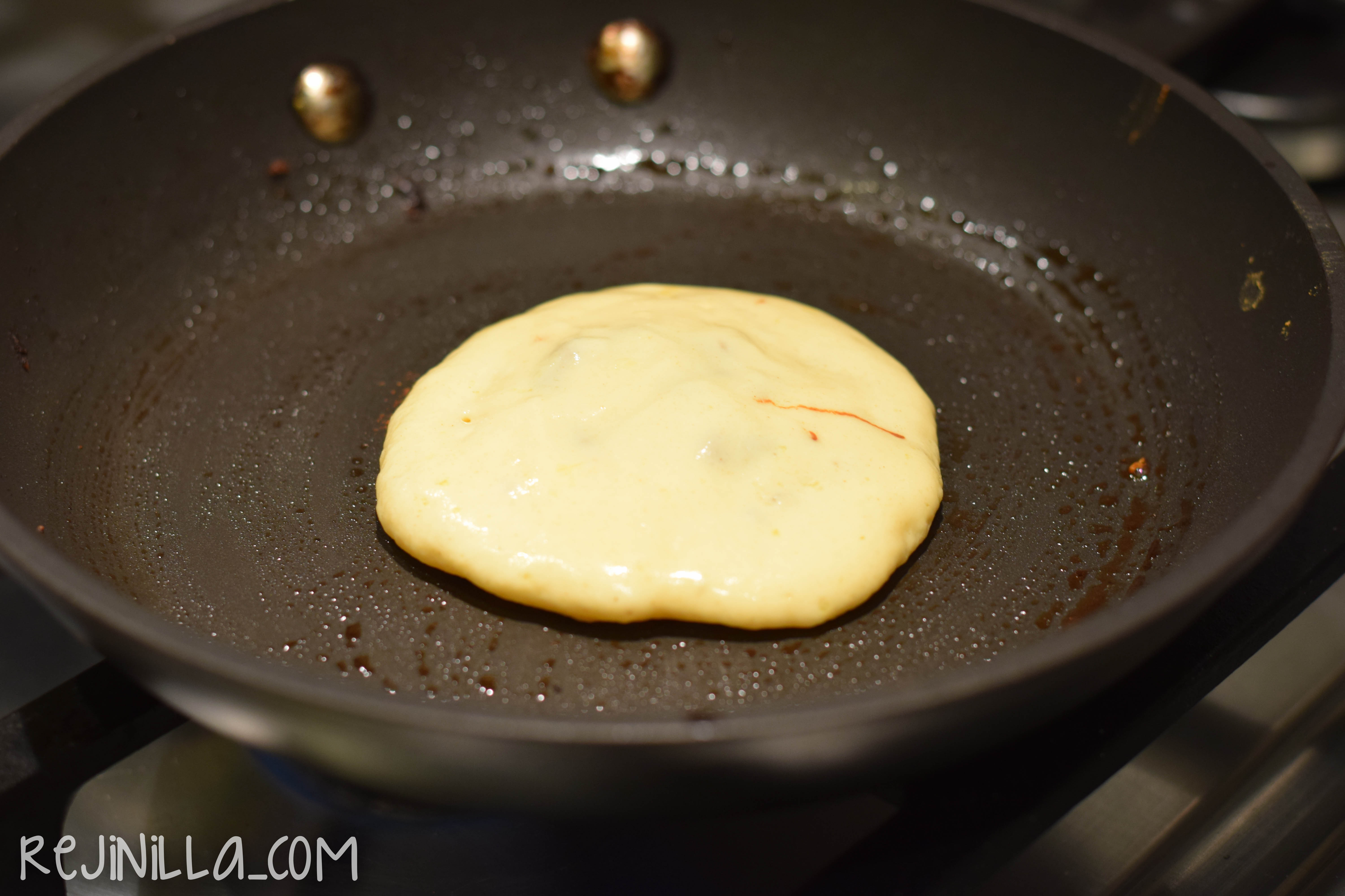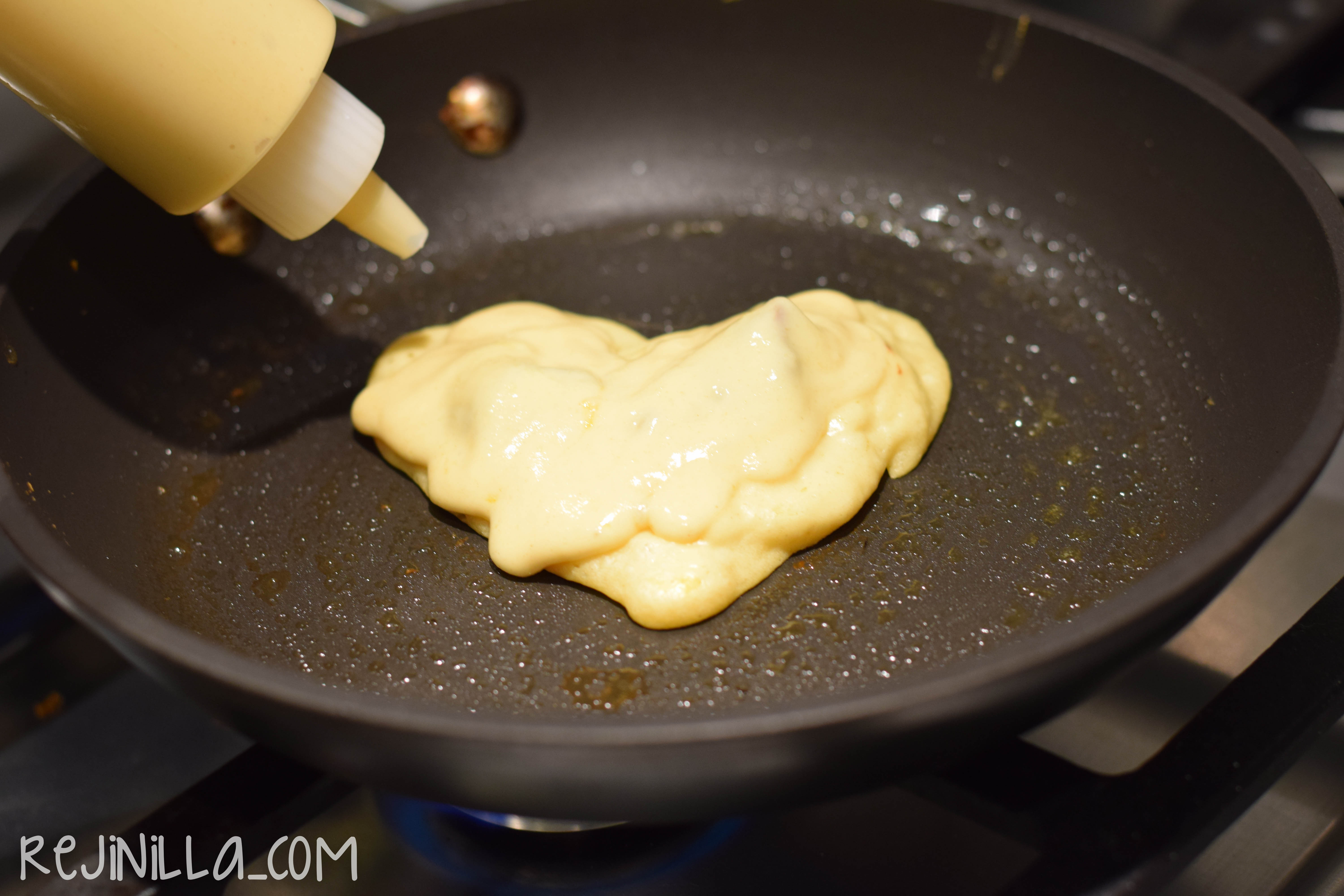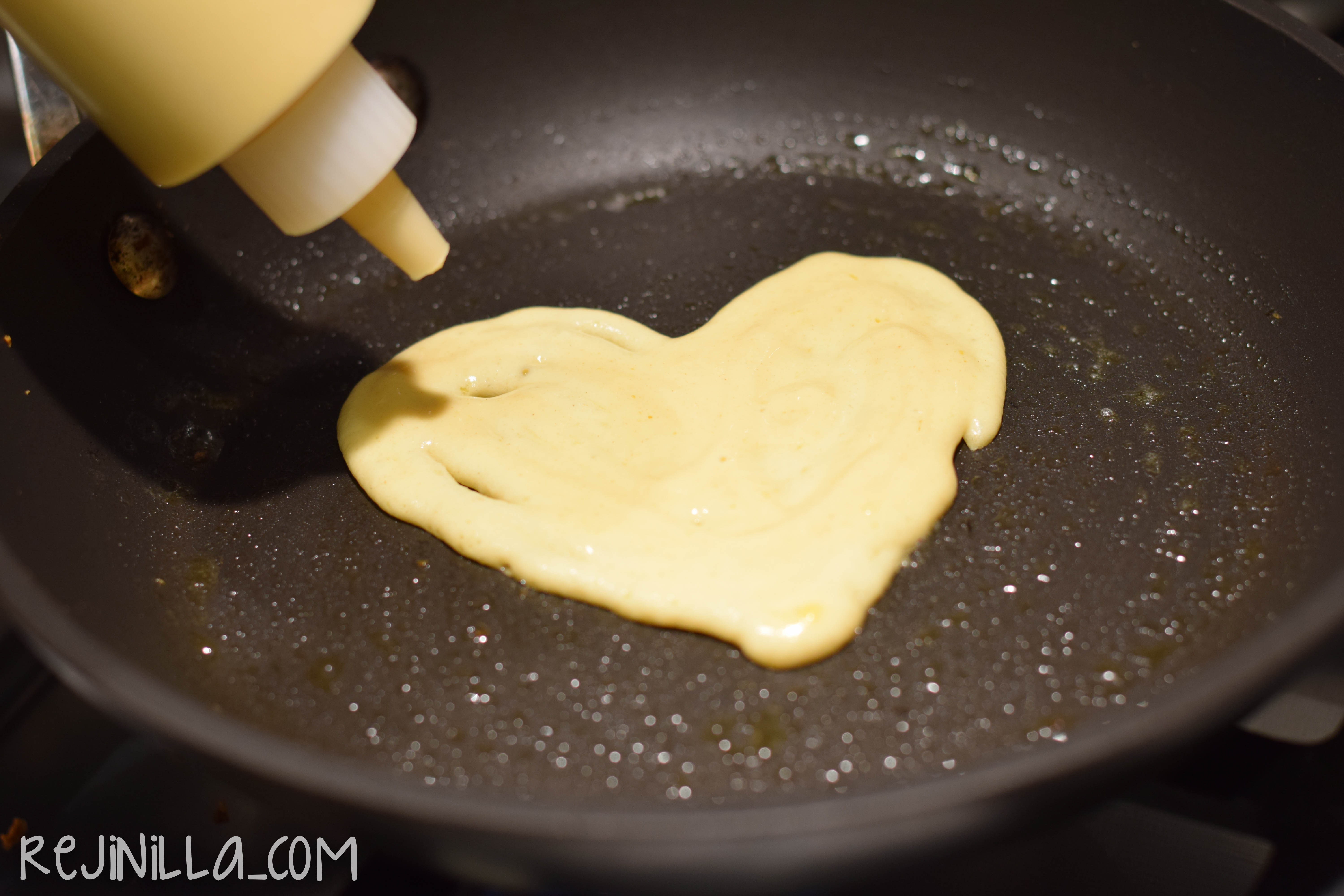 Empieza haciendo la masa de hotcakes, de cajita o tu preferida, puedes seguir mi receta de hotcakes con chispas de chocolate, o de coco con plátano. Como es San Valentín, los hice en forma de corazón, para esto, llené una botellita con un poco de masa y directo en el sartén caliente y enmantequillado, hice la figura.