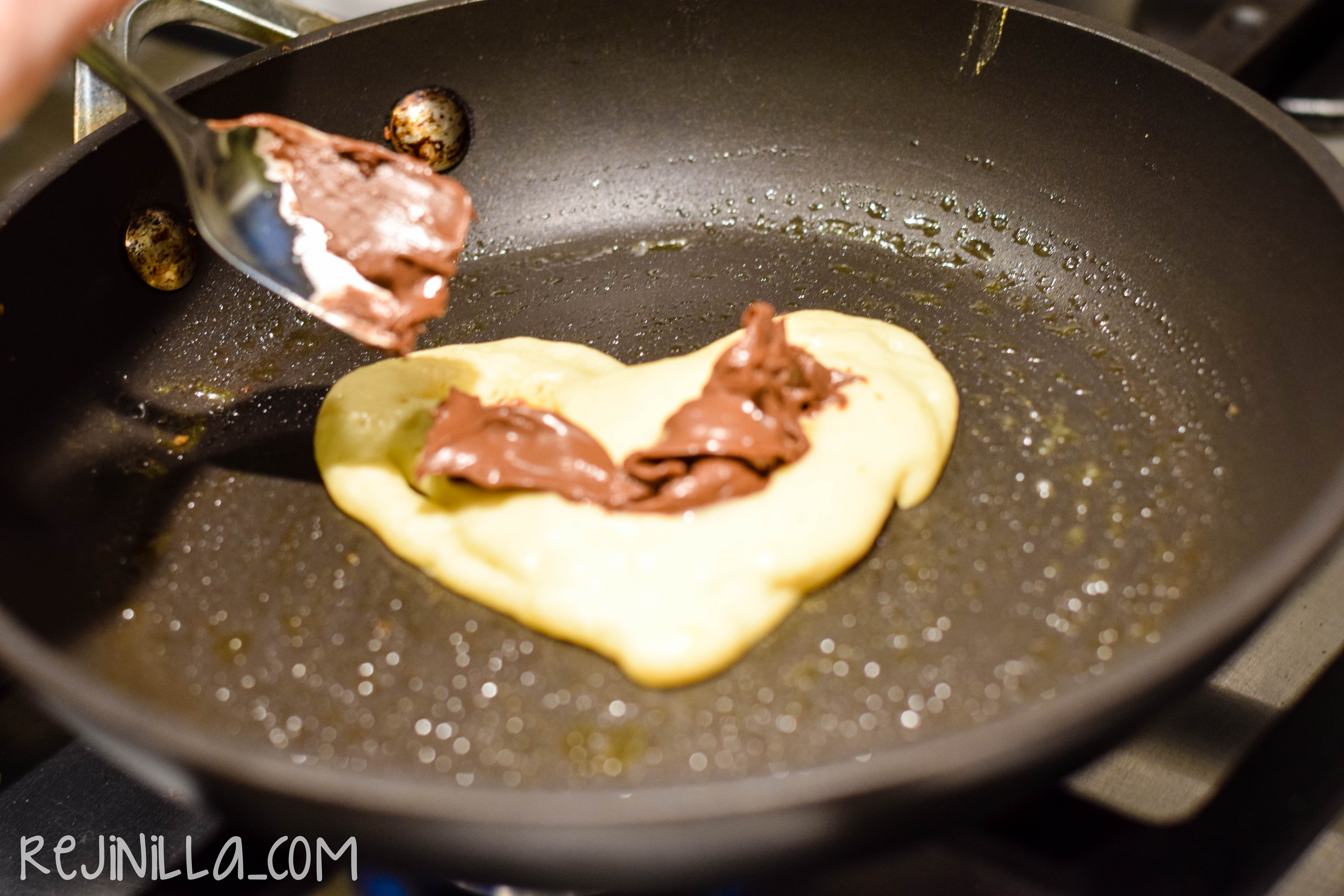 Ya que la primera capa empieza a burbujear, pon la Nutella. No se ve tan bonito, pero sabes que es deli.