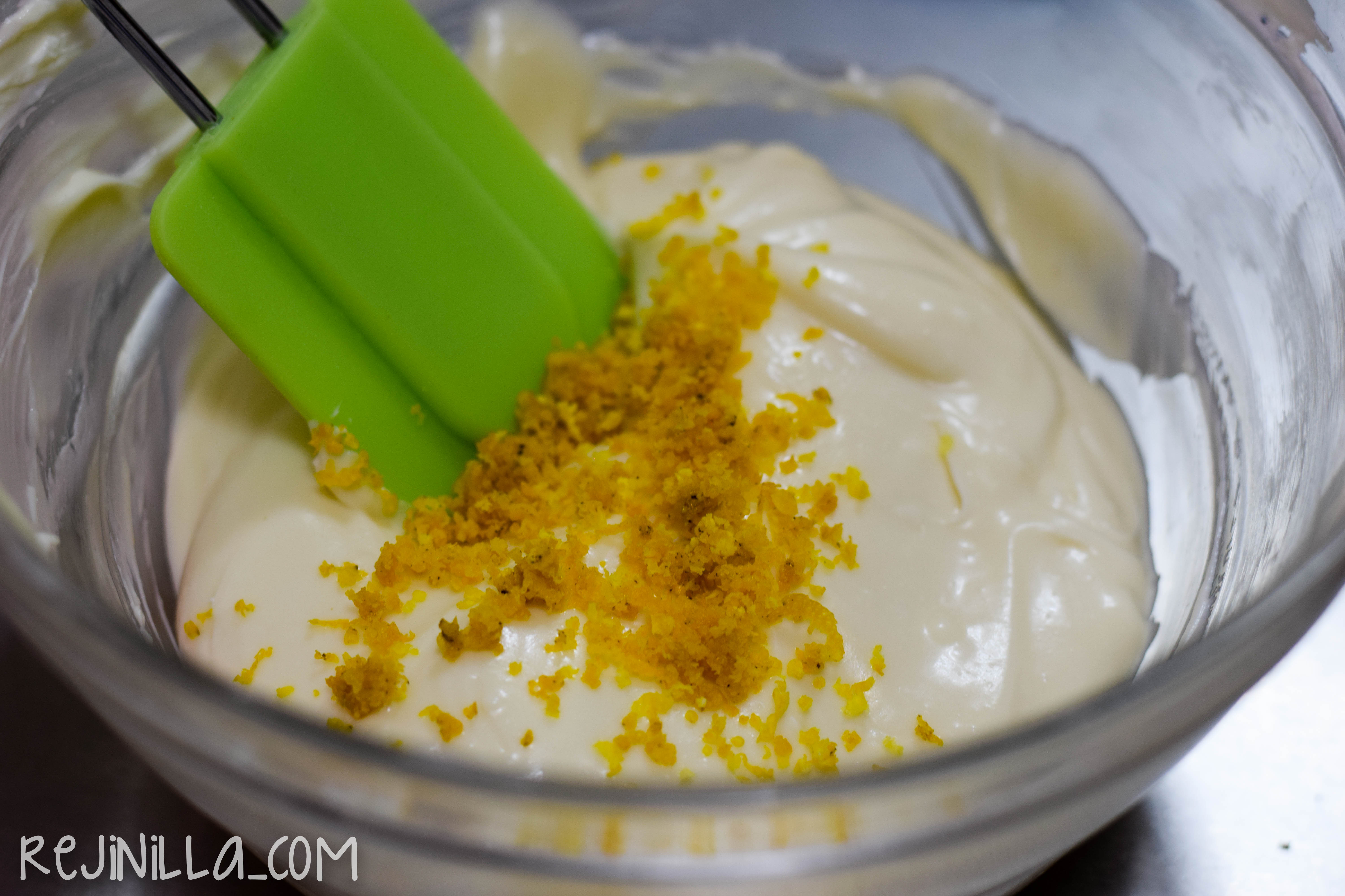 - Bate el queso y la mantequilla hasta que esté integrado y no haya grumos. Agrega el azúcar poco a poco, la vainilla y la naranja. Agrega un poco más de azúcar si lo quieres más dulce.