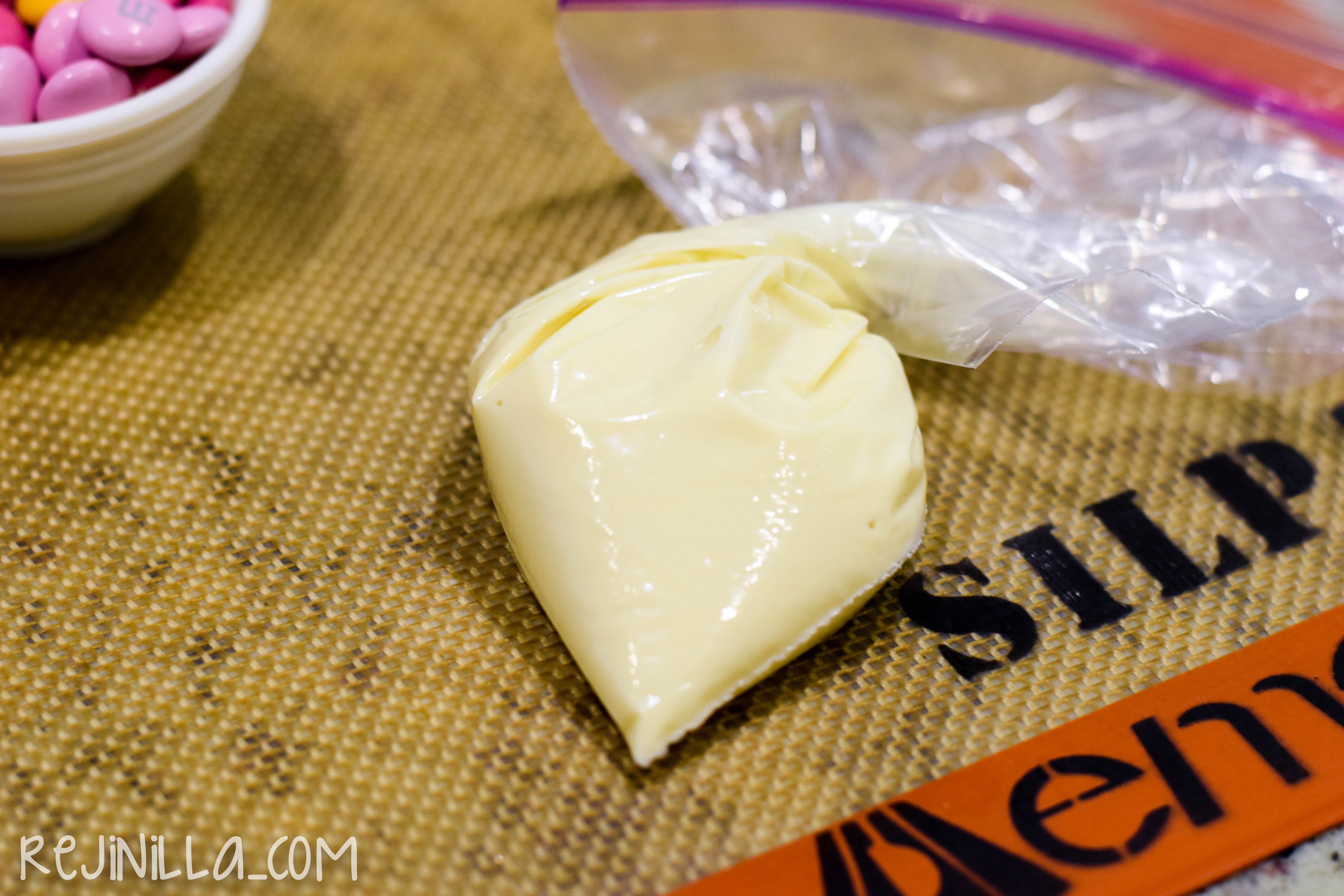 Derrite un poco de chocolate blanco en intervalos en el microondas y pasa a una bolsita, o usa el método más rápido y derrite en intervalos directo en una ziplock (viendo hacia atrás, no creo que sea lo más saludable… hmm).