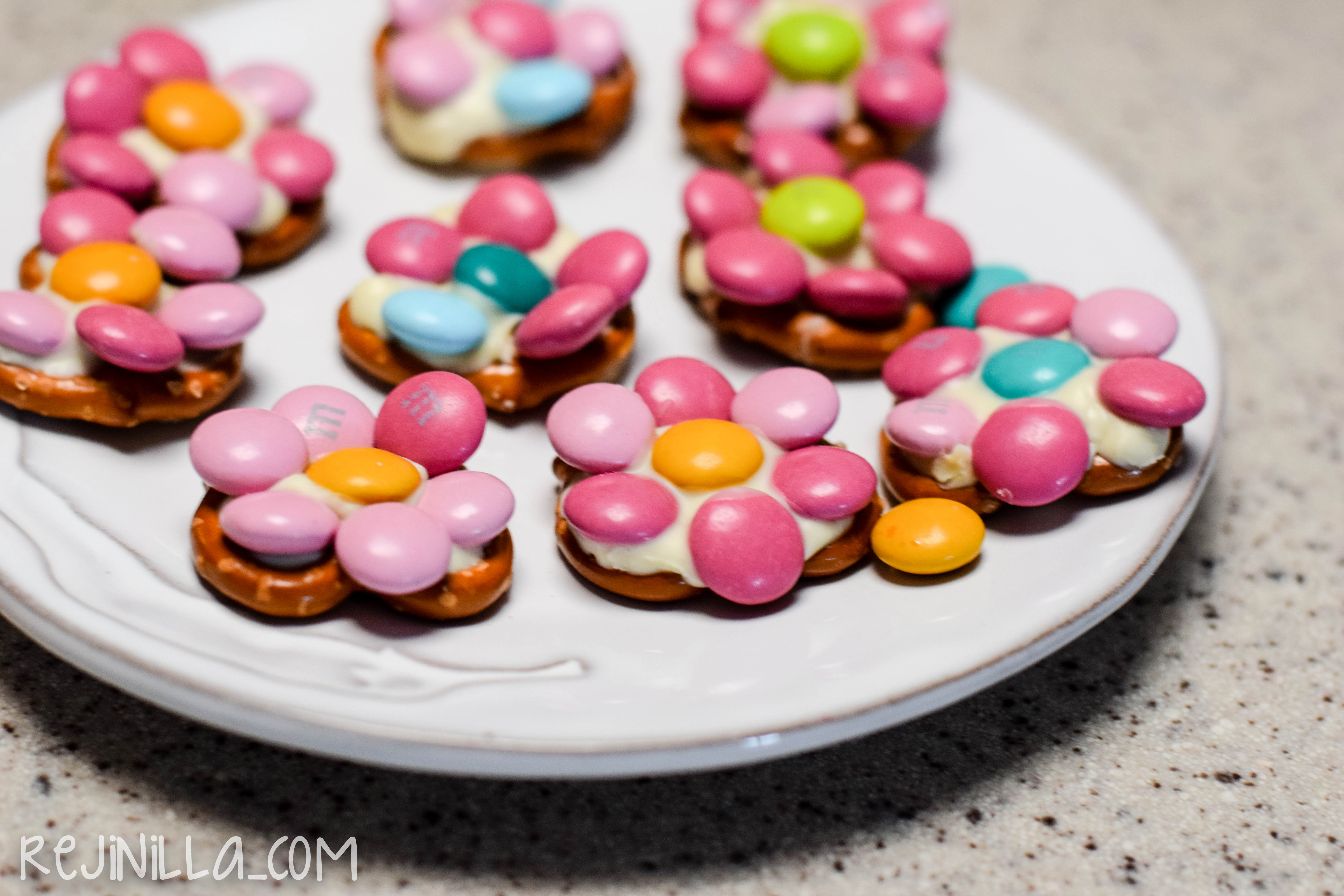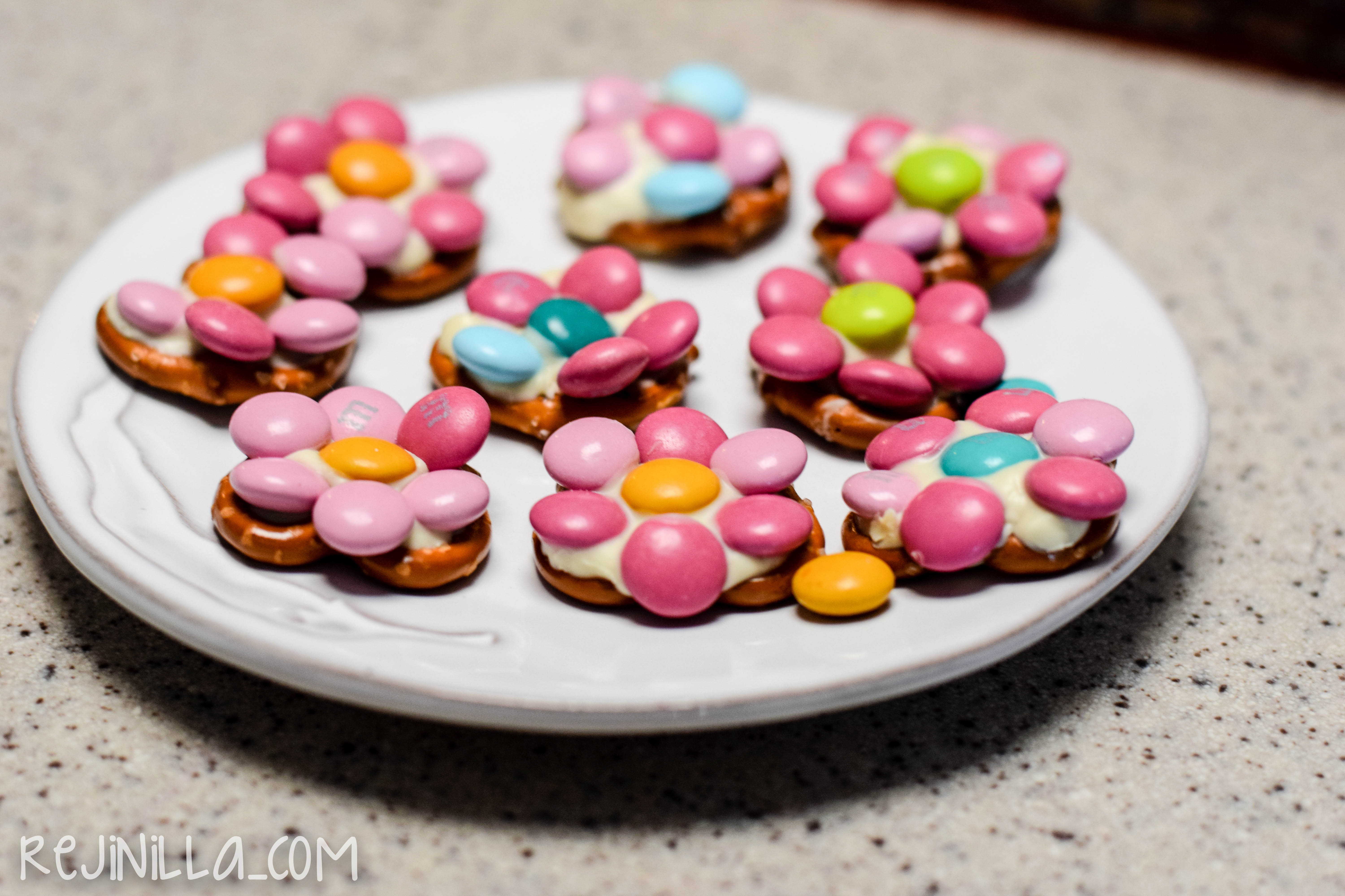 Bueno, me cacharon, no son pretzels de flores, son pretzels con chocolate blanco y lunetas en forma de flores. Muy primaverales y muy fáciles para que los niños ayuden… y también son ricos, no voy a mentir.
