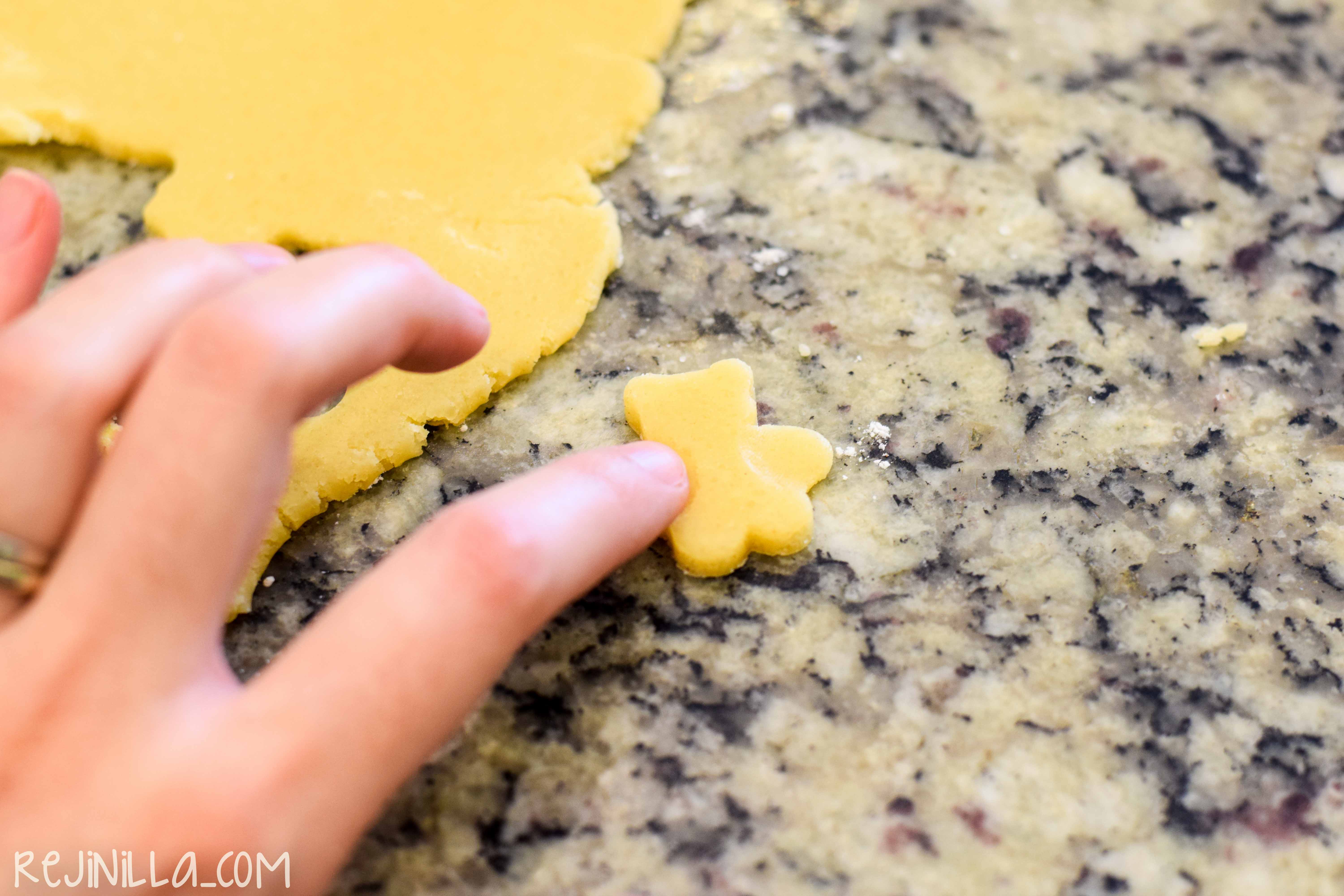 4. Extiende la masa con un rodillo enharinado, corta la figura que quieras, haz que abrace al dulcecito o luneta y acomoda en charolas para hornear. Hornea a 155ºC por 10-15 minutos o hasta que las orillas estén ligeramente doradas. Mientras más chica sea la galleta menos tiempo tomará en el horno.