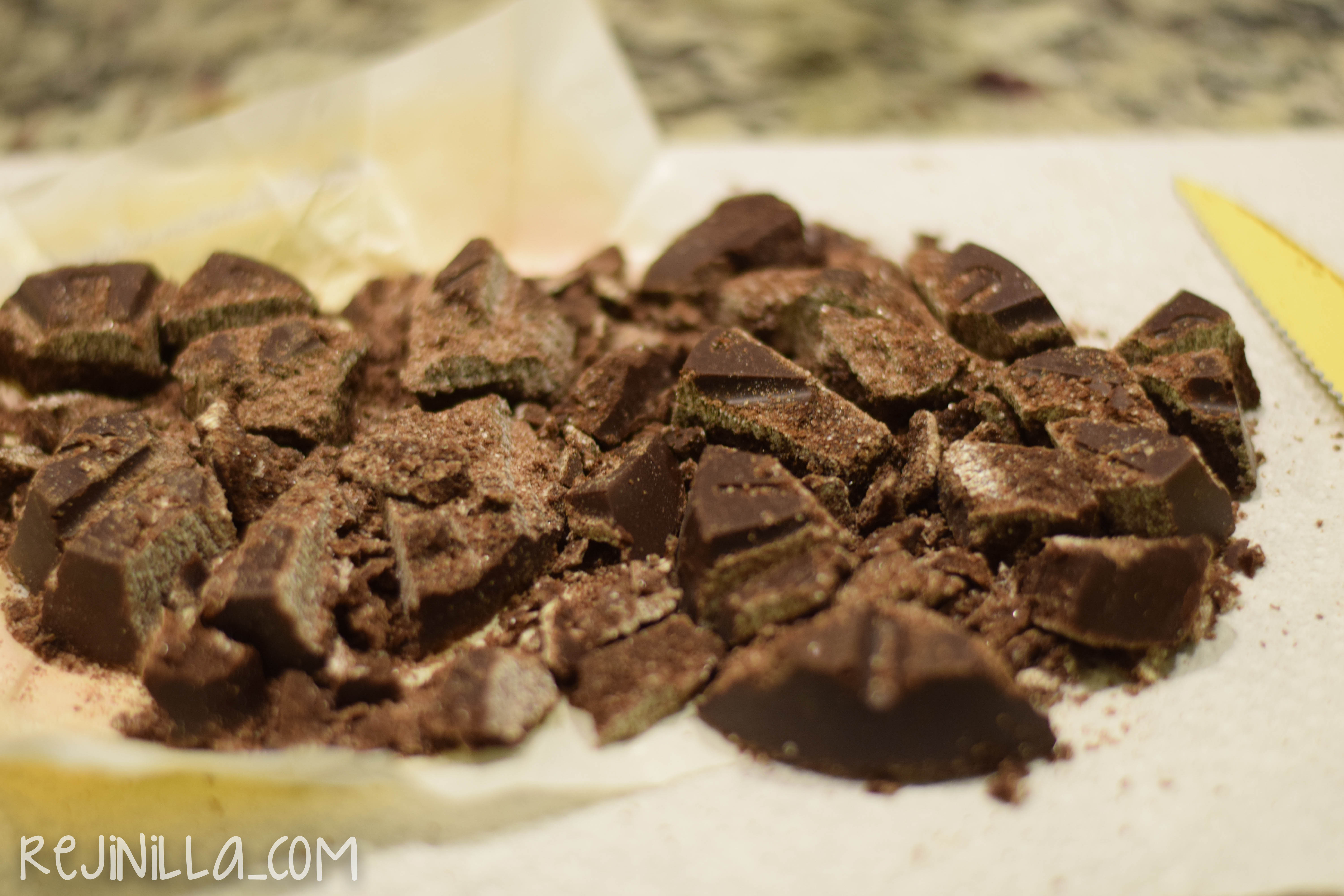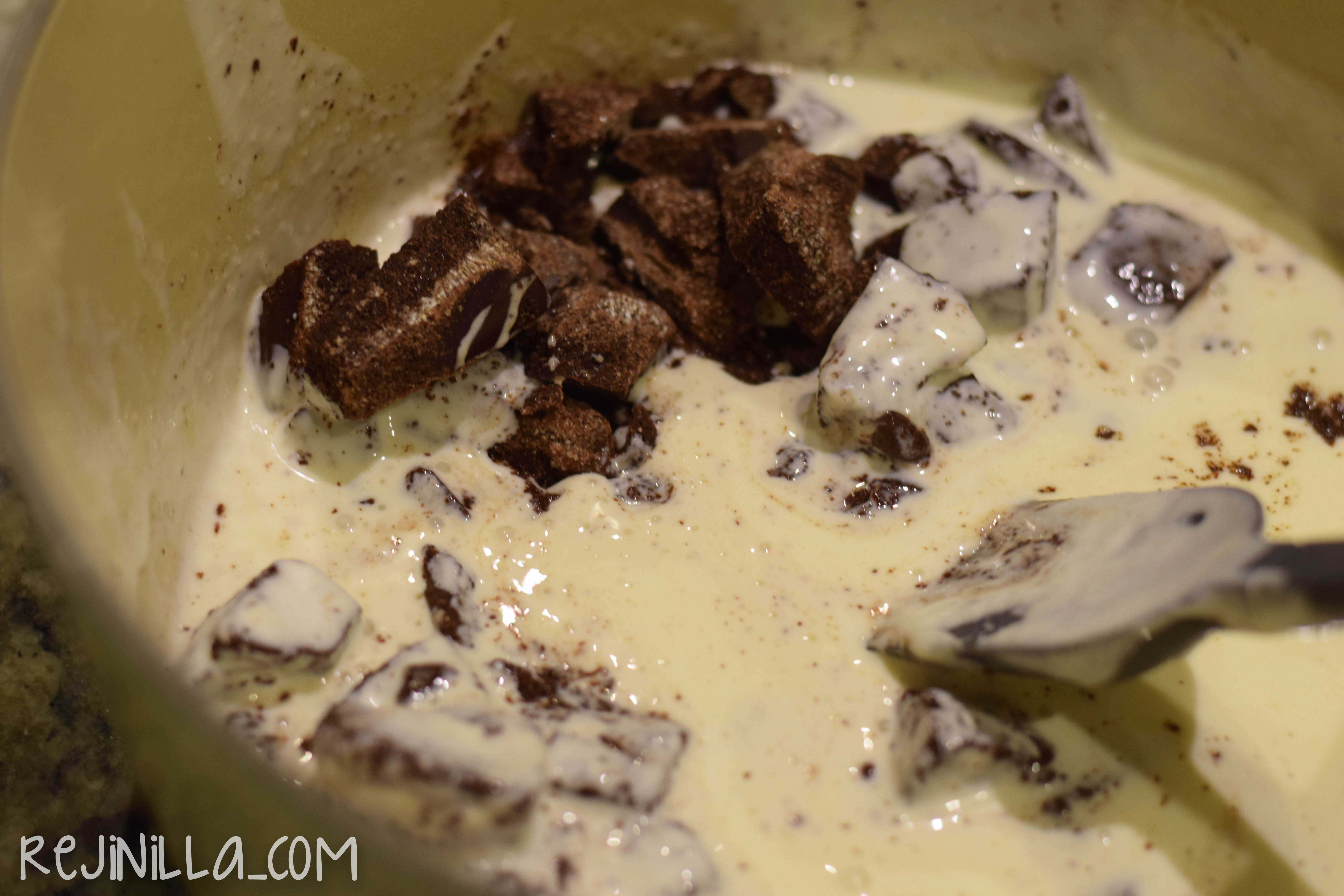 En una cacerola, calienta la crema y justo antes de que suelte el hervor, retira del fuego y agrega el chocolate. Revuelve hasta que este se derrita. Le puedes agregar algún sabor, canela, rayadura de naranja, pizca de café, vainilla o una copita de licor— yo recomiendo para empezar dejarlo simple.
