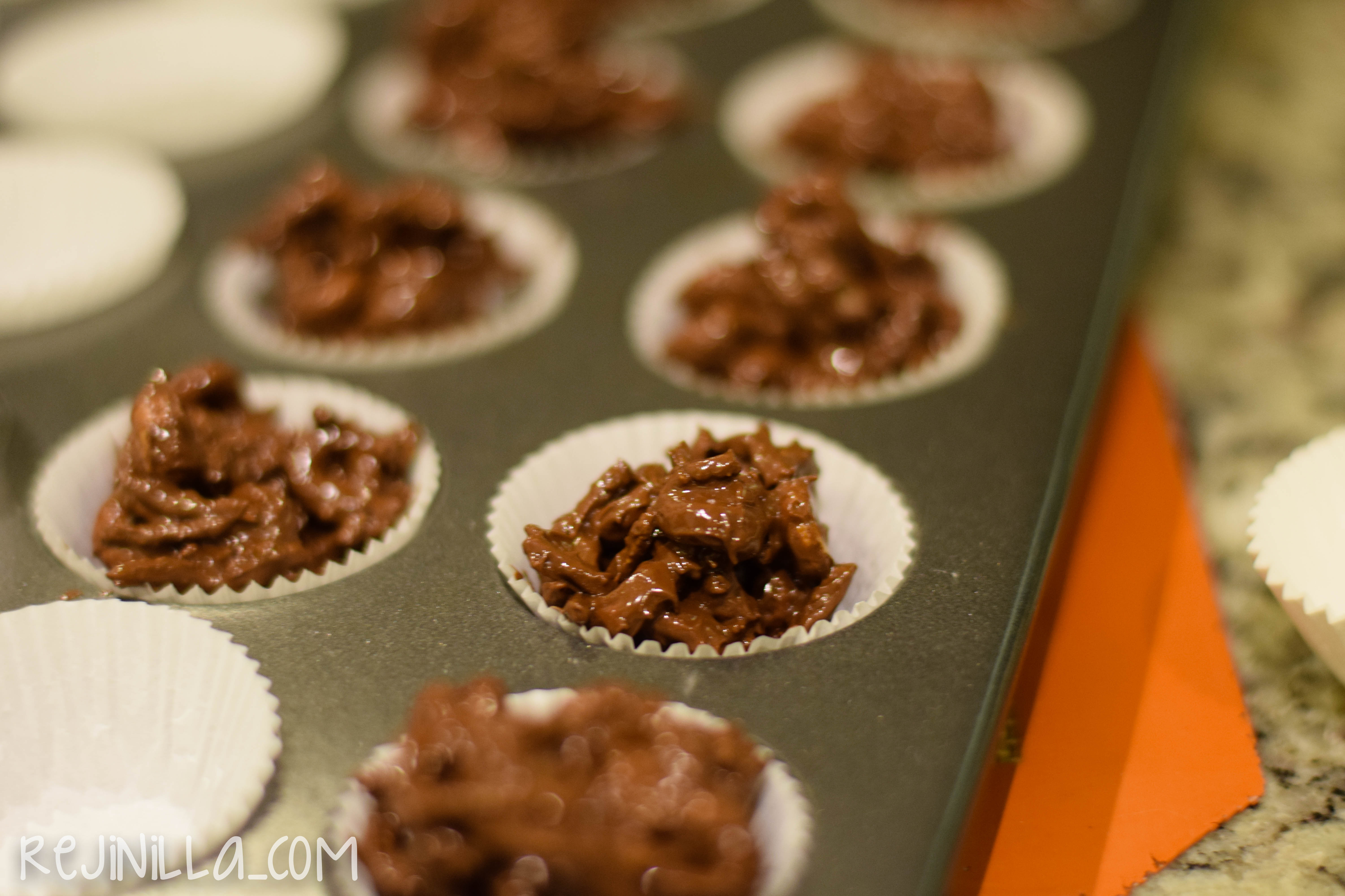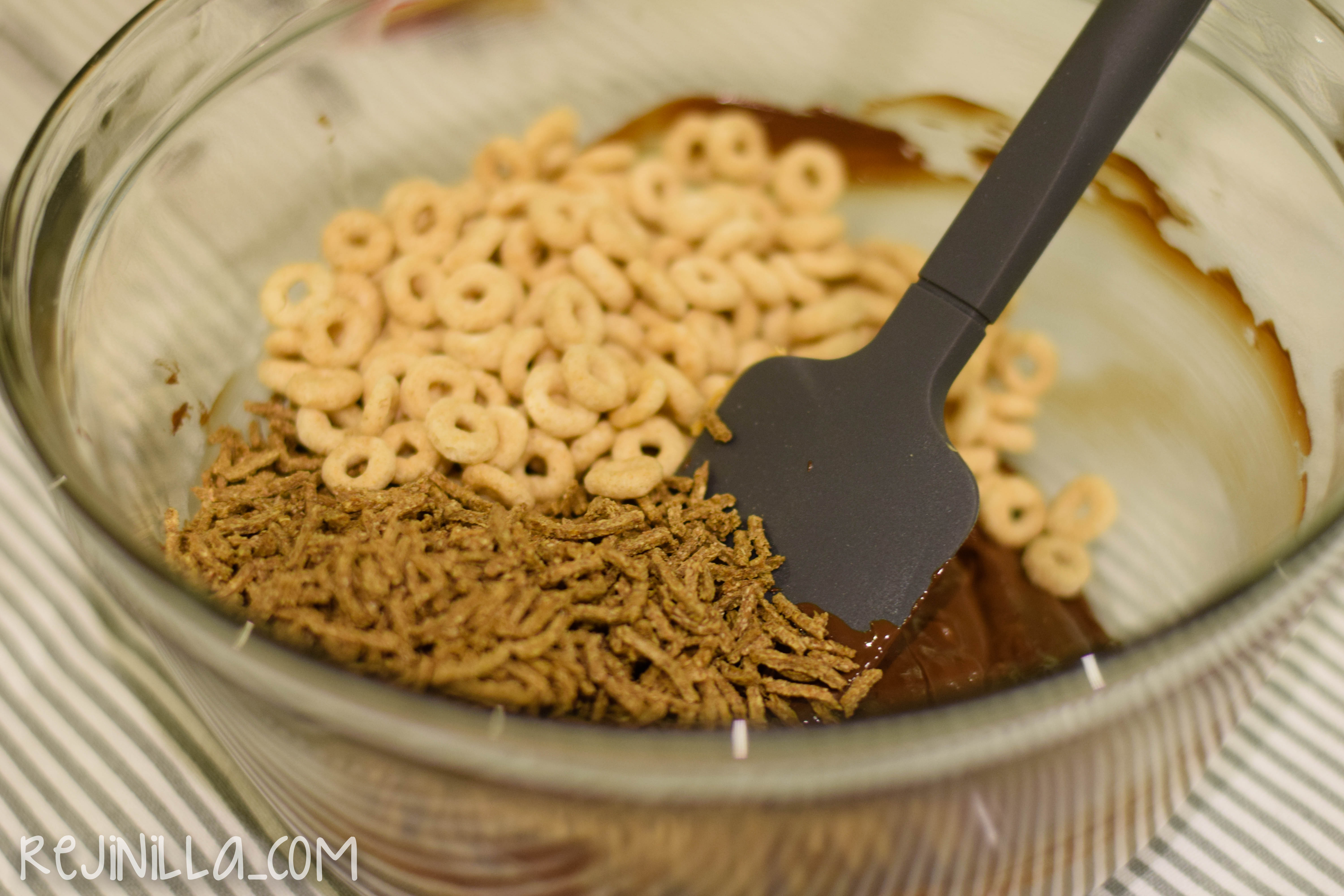 Luego agrega el cereal. Yo recomiendo cereal muy poco endulzado ( o sin endulzar si lo encuentran)… Mezcla bien y acomoda a cucharadas en moldes de mini cupcakes con capacillo.