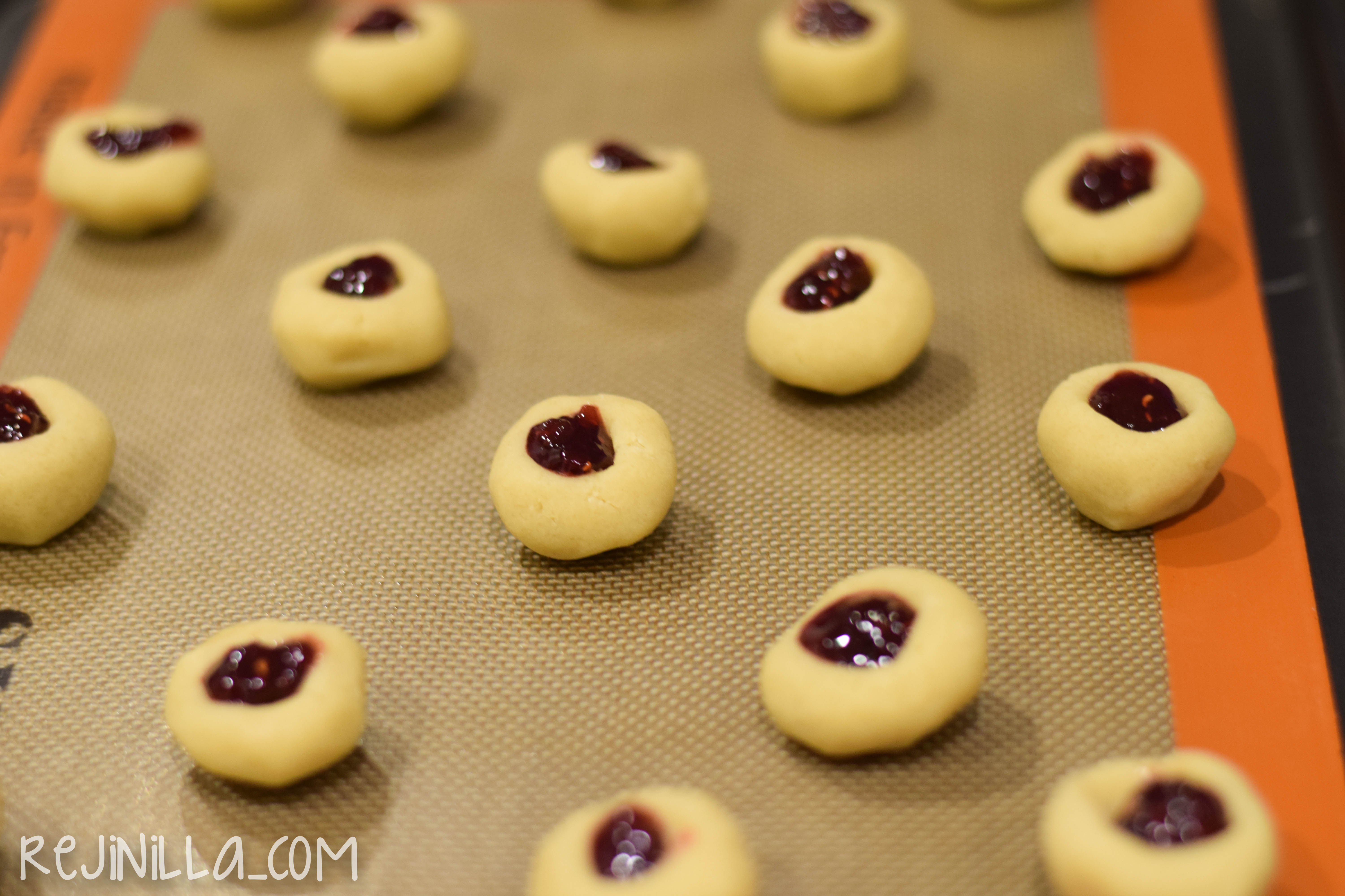 - Haz bolitas de masa y haz el hueco para la mermelada con la parte de atras de una cucharita o con el dedo. Refrigera las bolitas por al menos 2 horas o congela por 30 minutos.