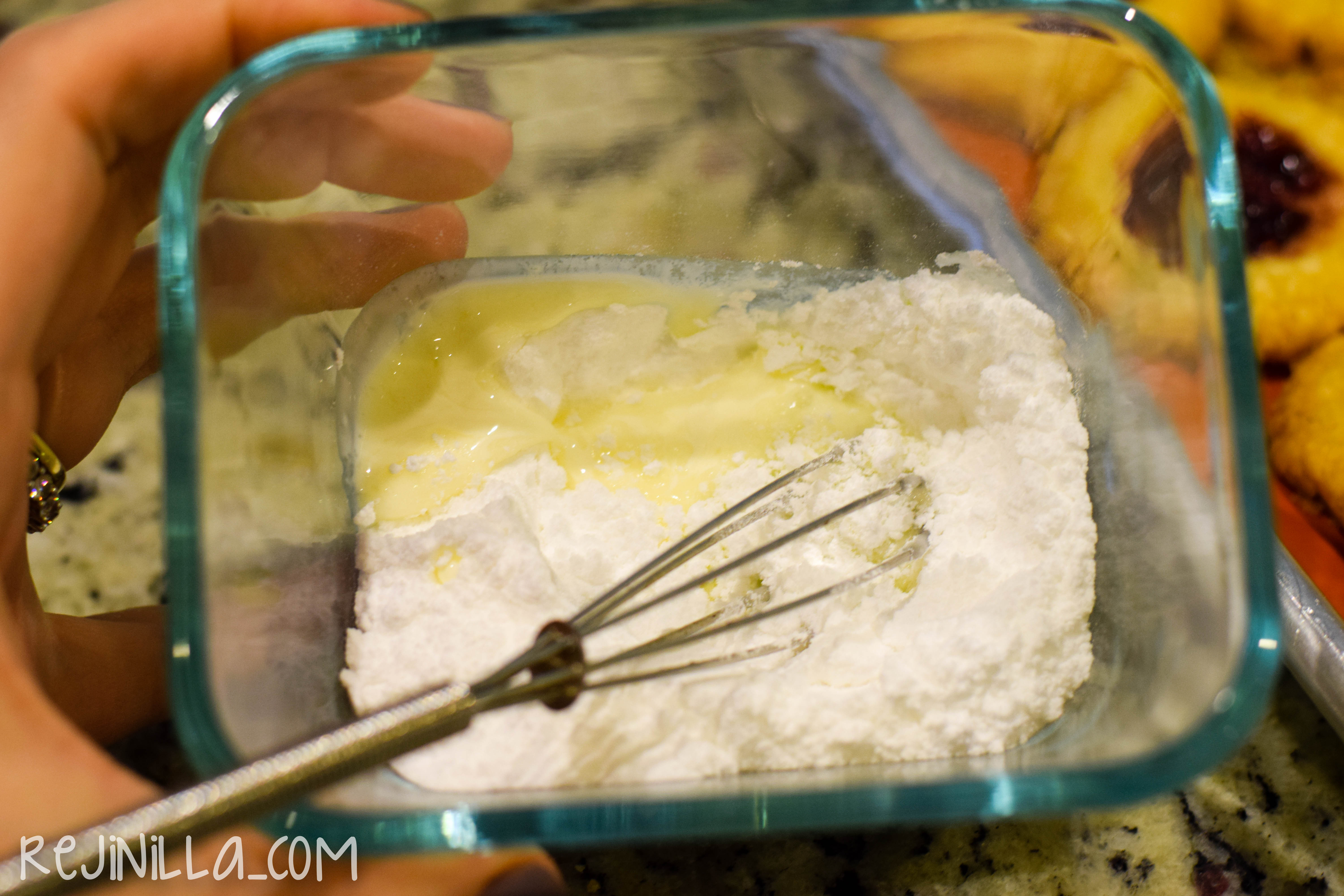 - Mientras tanto, prepara el glaseado mezclando los ingredientes hasta lograr una consistencia fluida.