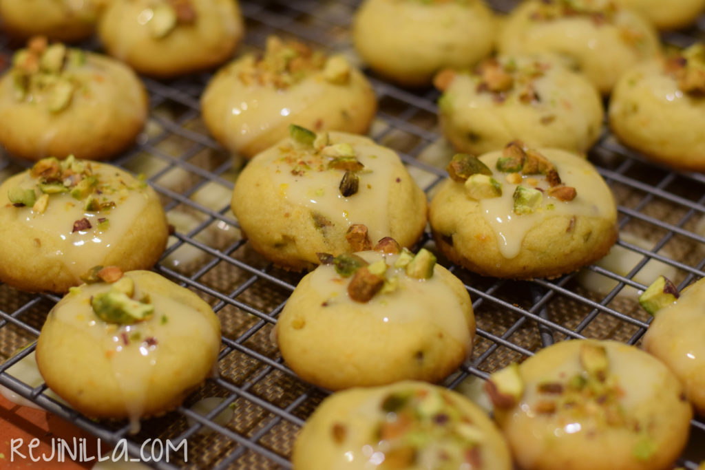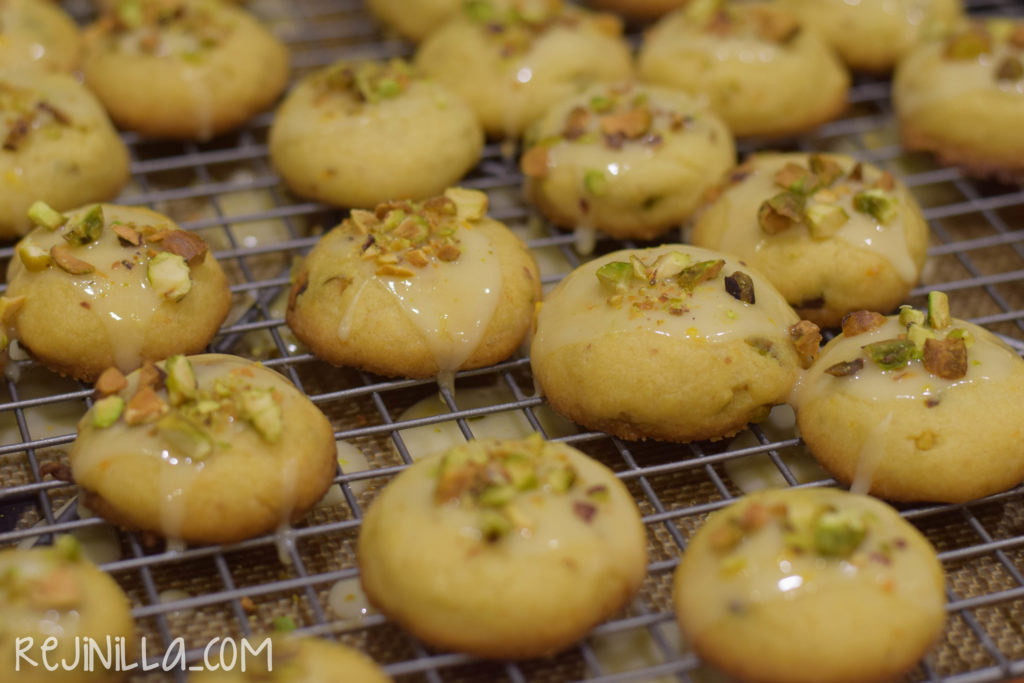 Mientras tanto, prepara el glaseado con jugo de naranja y azúcar glass. Pon un poco de glaseado sobre cada galleta (ya fría) y espolvorea pistaches picados sobre cada una. Deja que el glaseado seque.