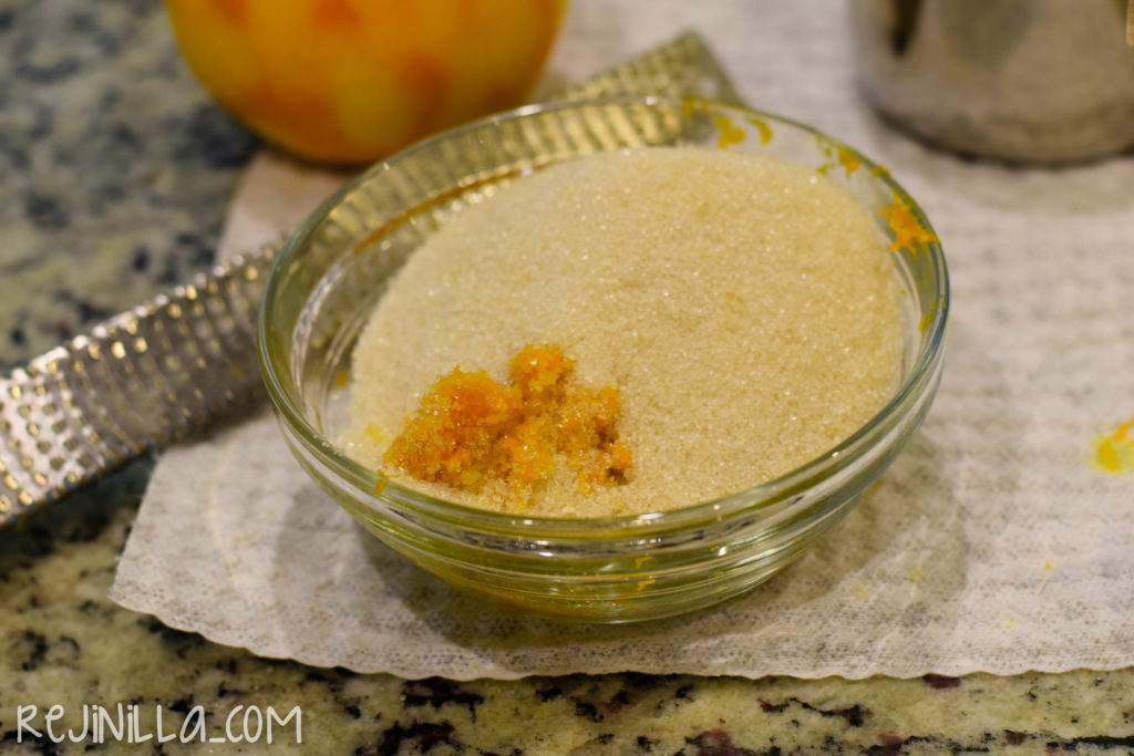 Empieza mezclando el azúcar con la ralladura de naranja, mezcla con los dedos para que el azúcar se impregne con los aceites de la cáscara de naranja.