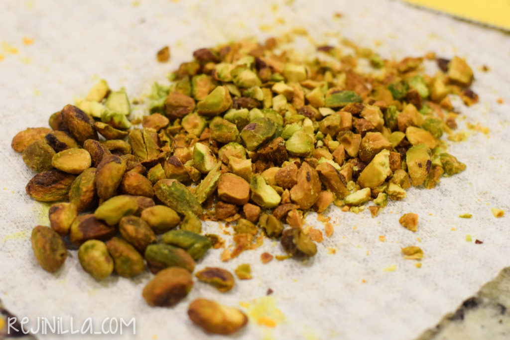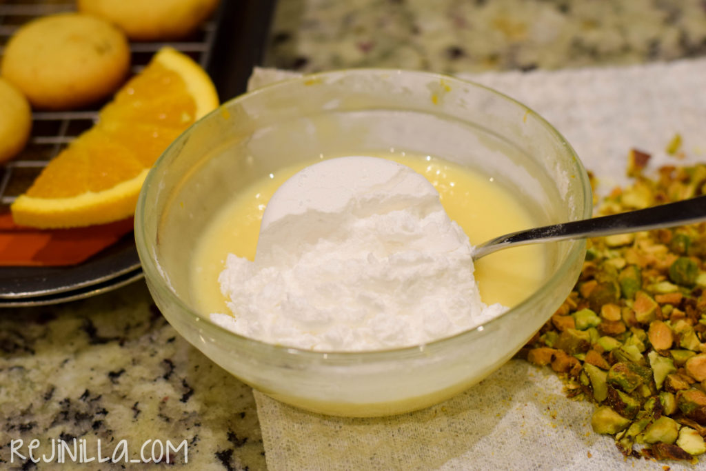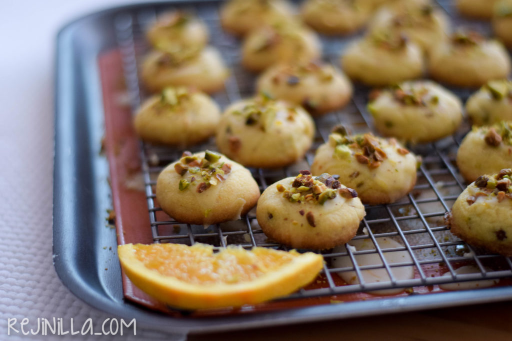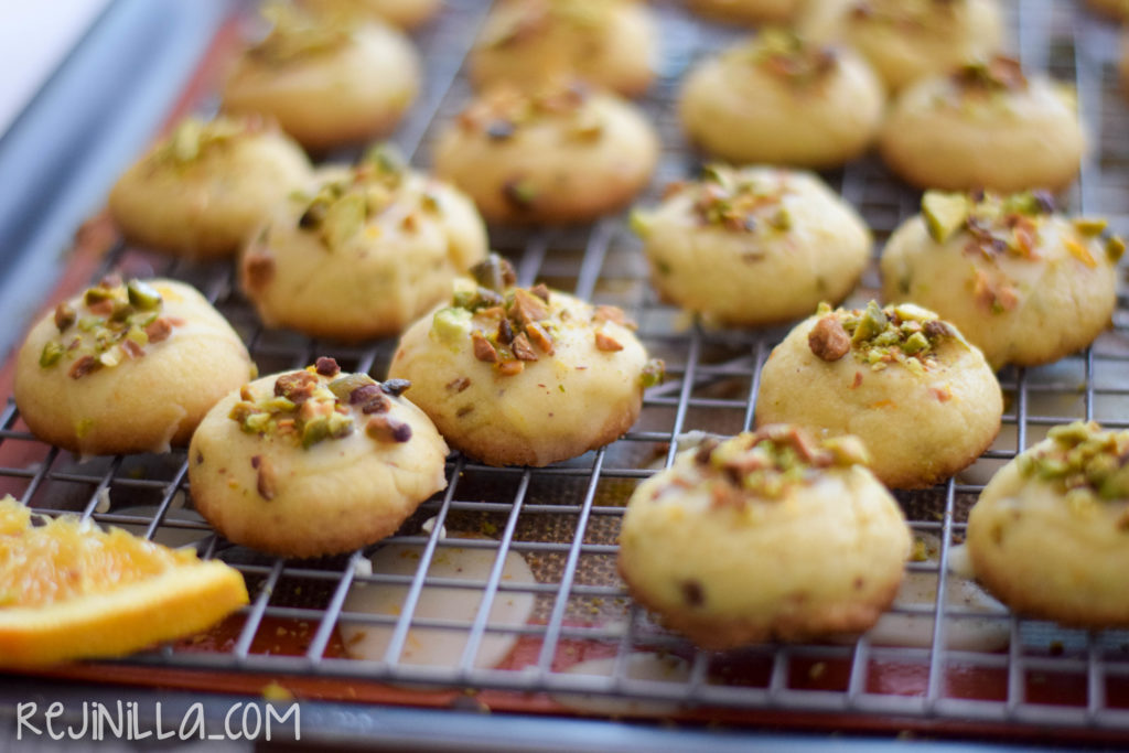 Mientras tanto, prepara el glaseado con jugo de naranja y azúcar glass. Pon un poco de glaseado sobre cada galleta (ya fría) y espolvorea pistaches picados sobre cada una. Deja que el glaseado seque.