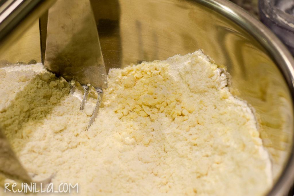Empieza ” cortando” la masa con la mantequilla, con los dedos, tenedor o con un cortador de masa. Mezcla y corta hasta formar grumitos de mantequilla y harina.