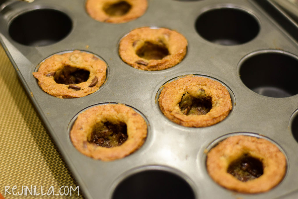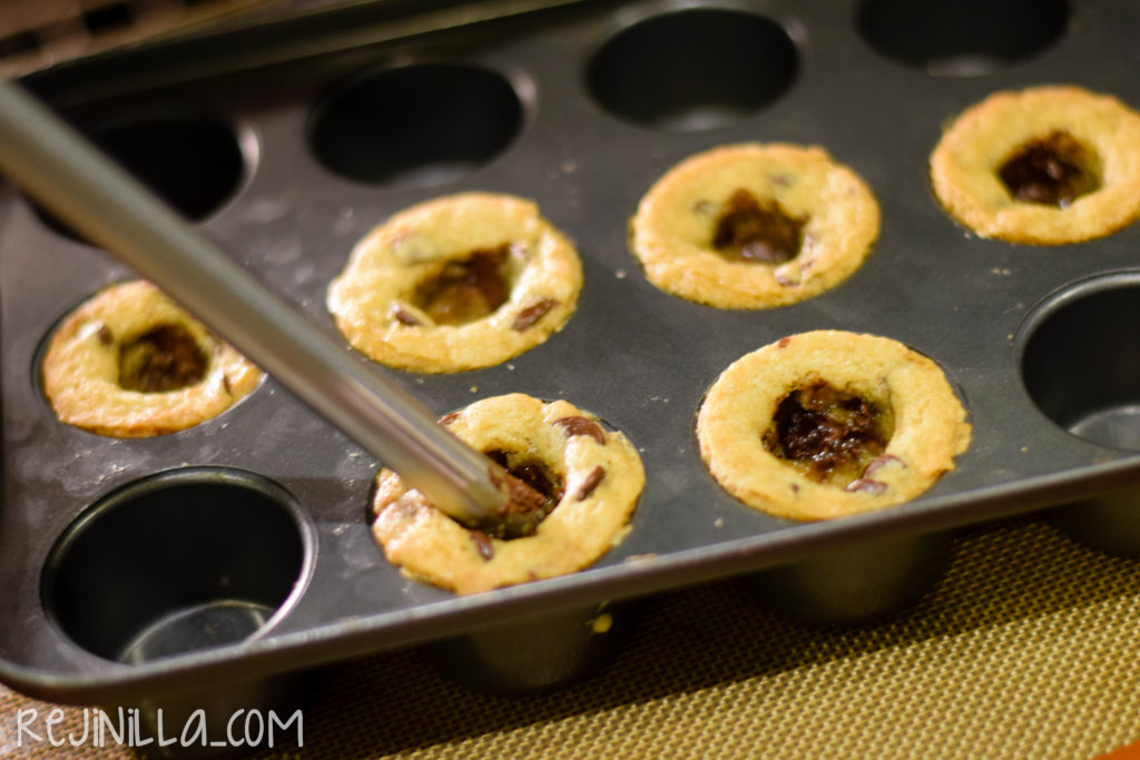 A la mitad de la cocción, usa la parte de atrás de una pala o cuchara y aplasta el centro ligeramente para darles forma de shot. Ya que están doraditas y recién salidas del horno, nuevamente, usa la pala para darles forma.