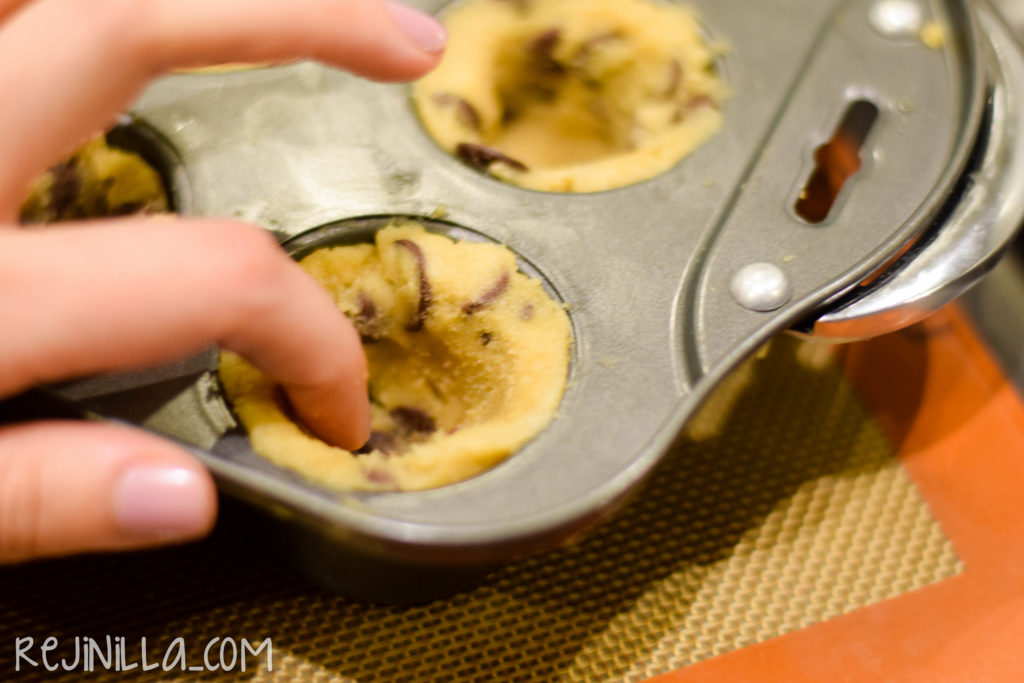 Usa moldes para shots, para pop-overs o para cupcakes (yo usé de mini cupcakes). Pon la masa de galletas en el fondo y las orillas, pegándola lo más posible para darle forma de vasito. Por cierto, no es necesario engrasar el molde.