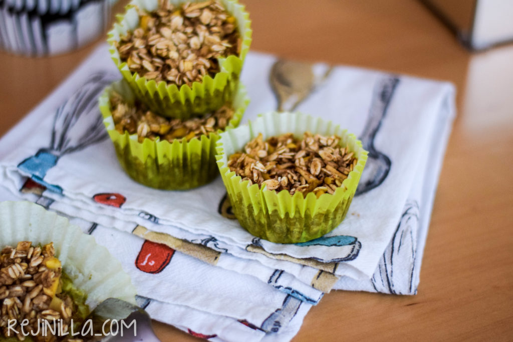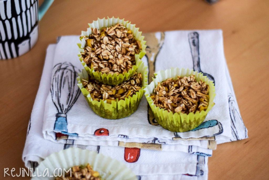 En el regreso a clases, de los retos más fuertes está el desayunar bien (también sin escuela, sigue siendo un reto para grandes y chicos). Esta es una receta para hacer avena de manzana para llevar, hecha en papelitos de cupcakes, es avena horneada lista para ser devorada a cualquier hora. Es libre de grasa, lácteos y gluten (asegúrate de comprar avena GF). Tiene todo lo bueno de la avena y manzana para empezar el día, ligeramente endulzado con miel de maple.
