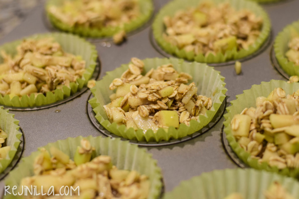 Acomoda en moldes para cupcakes con capacillo, y aplasta ligeramente. La mezcla será muy liquida, asegúrate de que cada cupcake tenga avena y manzana y leche.