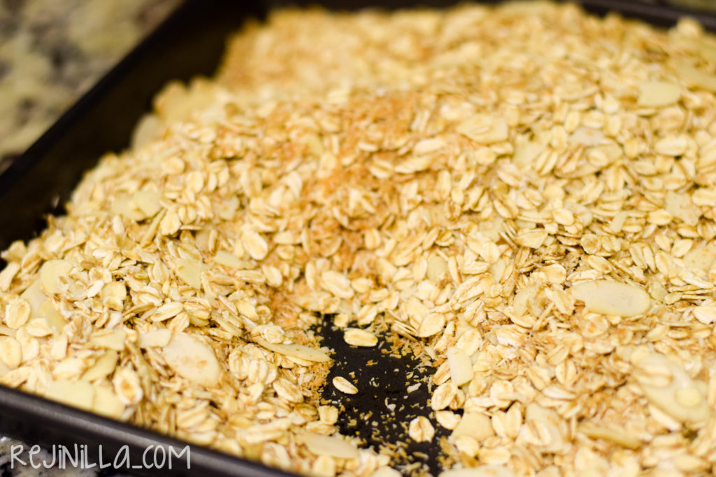 Empieza tostando 10 minutos en el horno la almendras, avena y coco. Revuelve a los 5 minutos.