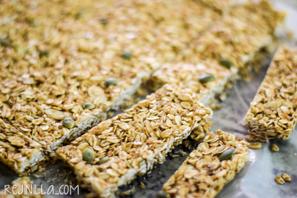 Integra perfectamente. Si quieres, agrega otro tipo de nueces tostadas, fruta seca picada, chispas de chocolate, etc. Yo agregué un puñito de semillas de calabaza. Las barritas son naturalmente libres de gluten, si lo necesitas, asegúrate de usar ingredientes certificados como gluten free (la avena regular puede contener trazas de harina o gluten, la certificada no).