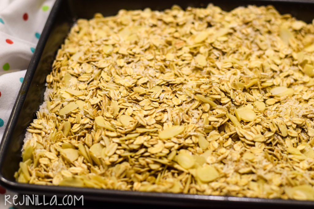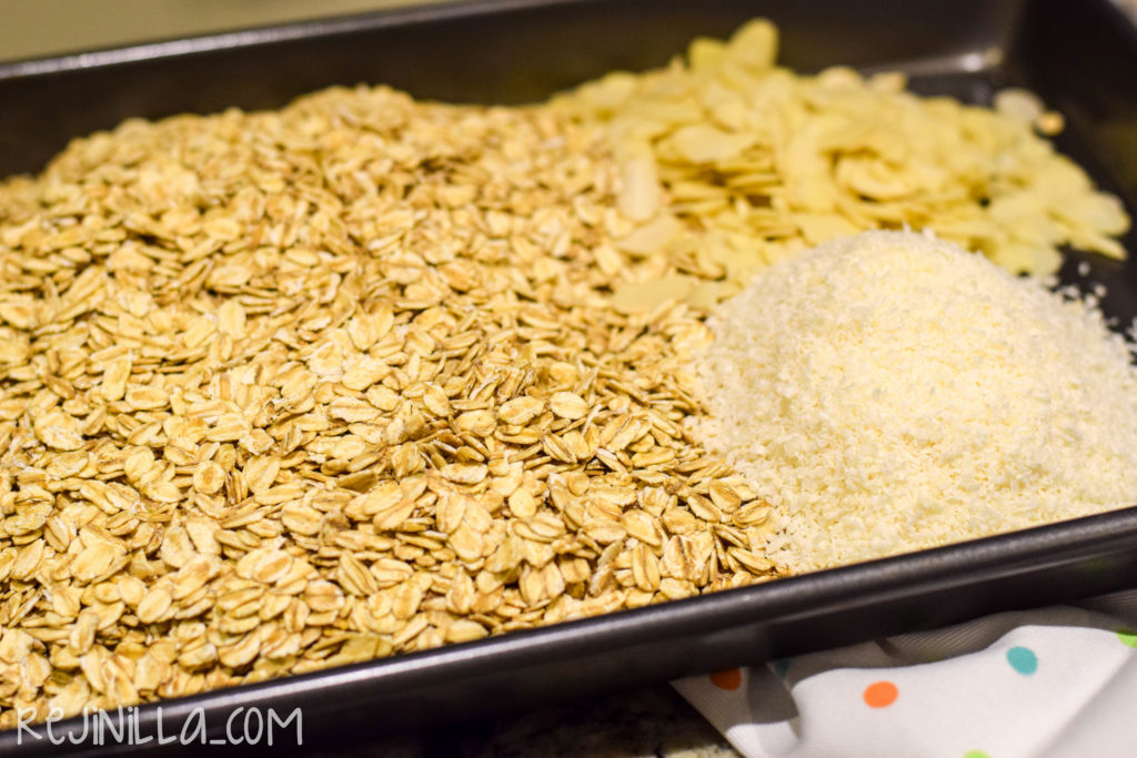 Empieza tostando 10 minutos en el horno la almendras, avena y coco. Revuelve a los 5 minutos.