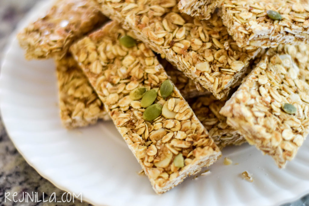 Integra perfectamente. Si quieres, agrega otro tipo de nueces tostadas, fruta seca picada, chispas de chocolate, etc. Yo agregué un puñito de semillas de calabaza. Las barritas son naturalmente libres de gluten, si lo necesitas, asegúrate de usar ingredientes certificados como gluten free (la avena regular puede contener trazas de harina o gluten, la certificada no).