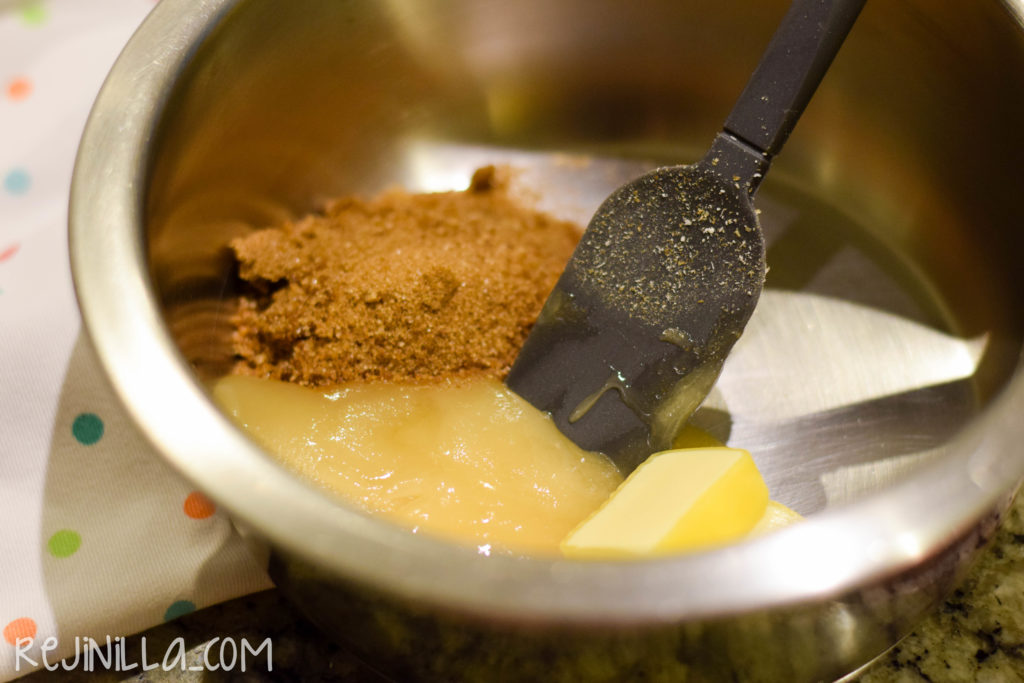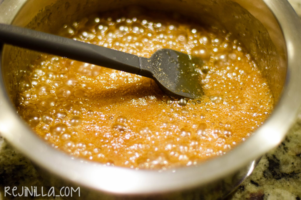• En una cacerola, mezcla la mantequilla, miel, agua y azúcar, hieve para crear un jarabe.