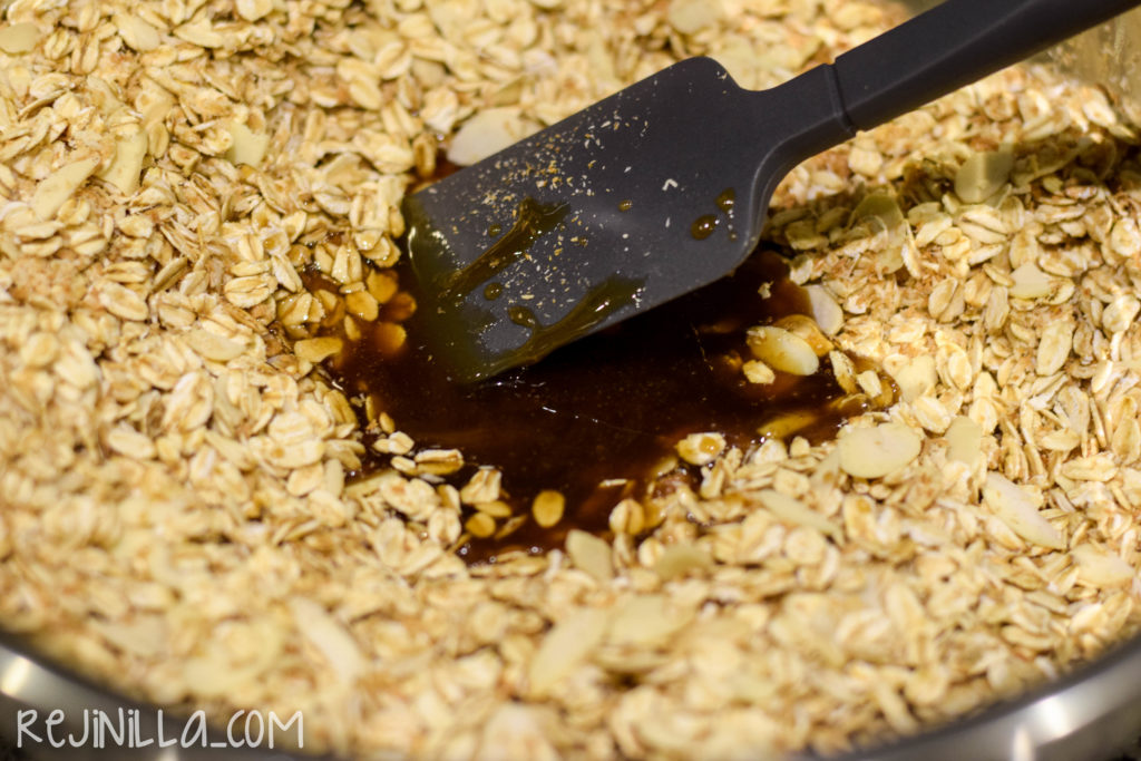 • Con cuidado, mezcla los ingredientes secos con el jarabe hasta que esté completamente integrado.