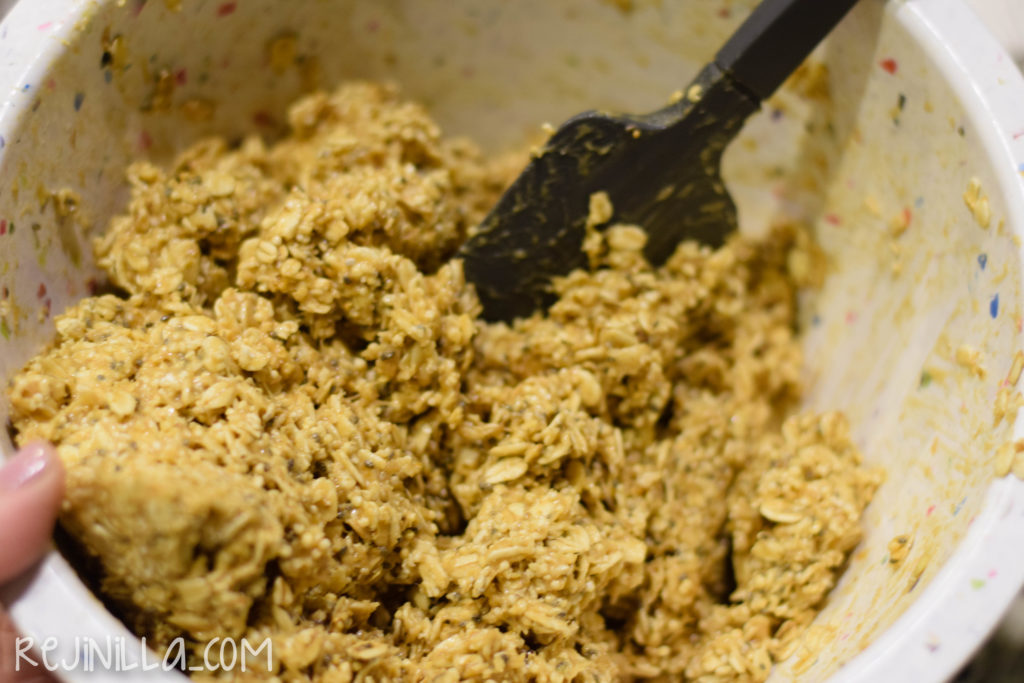Empieza con el plátano maduro, avena, miel y crema de almendras. Mezcla bien.