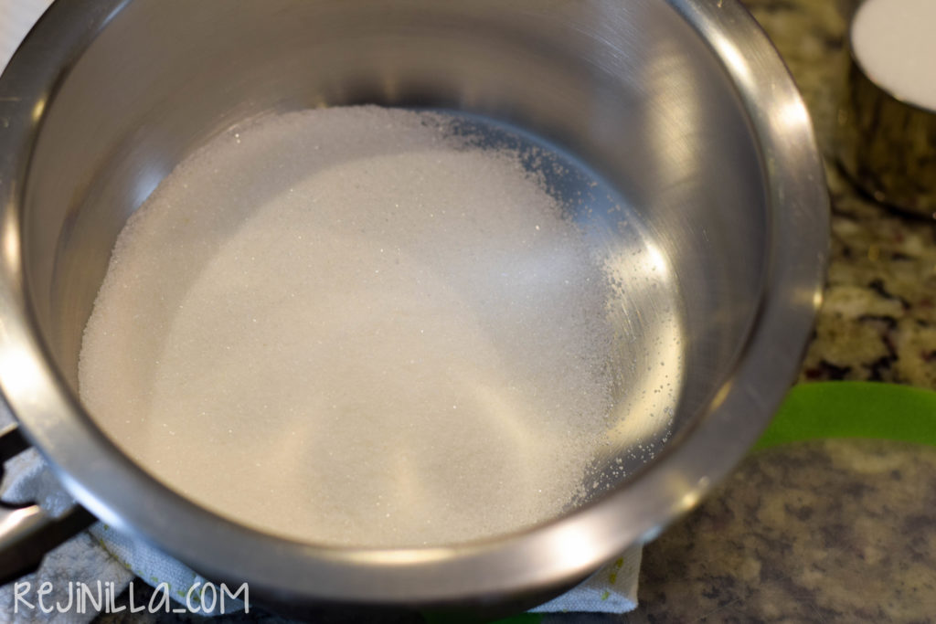 Pon el azúcar en una cacerola limpia y cocina a fuego medio, sin mover demasiado hasta que se empiece a derretir. Continua cocinando hasta que se torne color un color dorado.